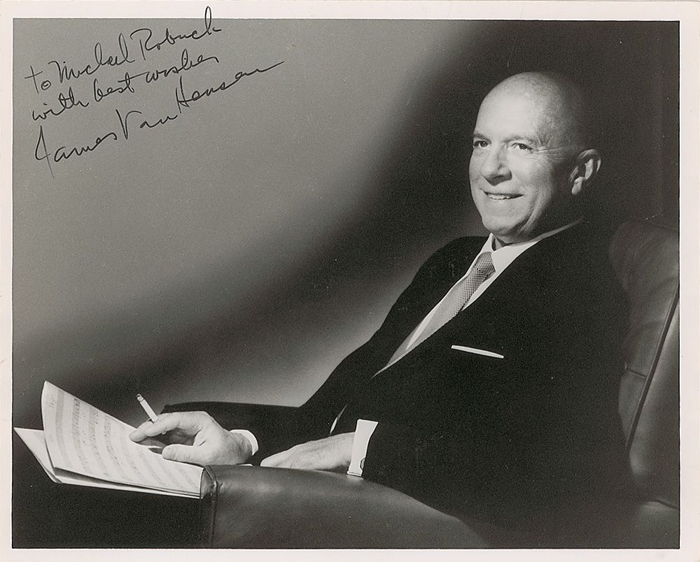 Matte-finish 8 x 10 photo of Van Heusen reviewing some scores, signed and inscribed in black felt tip “To Michael Robuck, with best wishes, James Van Heusen.” Rippling to the left and right edges, otherwise fine condition.