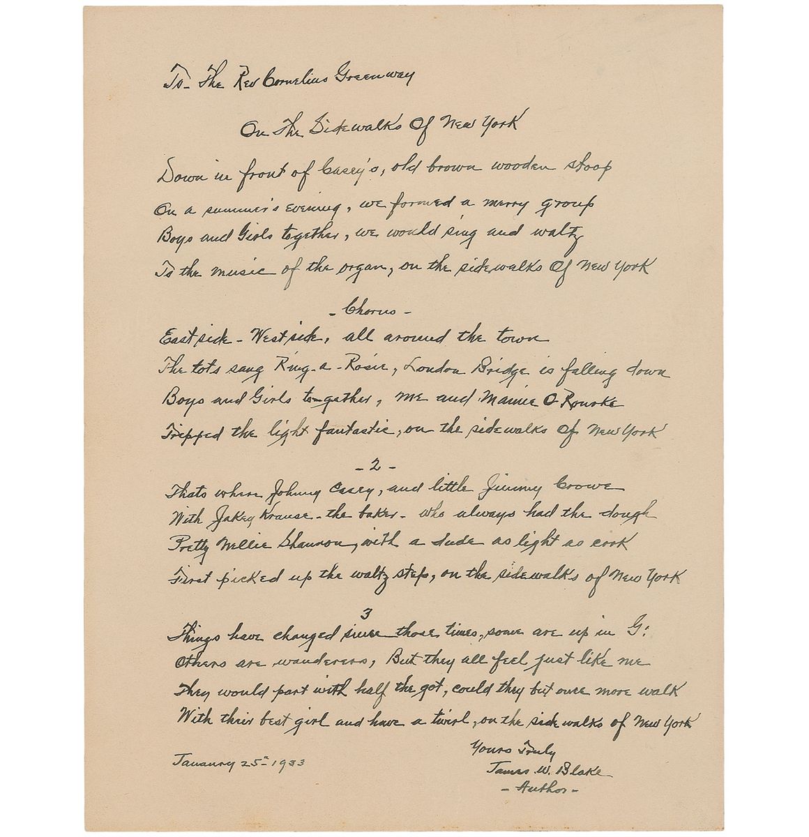 Lyricist (1862–1935) who wrote the popular song ‘The Sidewalks of New York,’ performed by the likes of Mel Torme, Duke Ellington, Larry Groce, and The Grateful Dead. Souvenir handwritten lyrics, one page, 8.5 x 11, January 25, 1933, signed and inscribed in ink, “To The Red Cornelius Greenway, James W. Blake—Author.” Blake pens the complete lyrics to his famous song, titling it at the top, “On The Sidewalks of New York.” In part: “Eastside—Westside, all around the town / The tots sang Ring-a-Rosie, London Bridge is falling down / Boys and girls together, me and Mamie O'Rourke / Tripped the light fantastic, on the sidewalks of New York.” In fine condition.