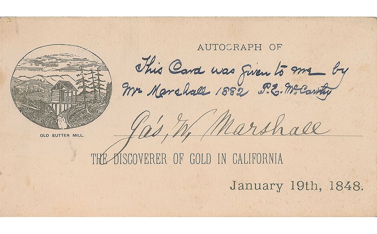 American carpenter (1810–1885) who discovered gold in California’s American River while constructing a mill for John Sutter, setting the stage for the California Gold Rush. Rare off-white 5.25 x 2.75 souvenir autograph card featuring an image of Old Sutter Mill, neatly signed in black ink, “Ja’s, W, Marshall,” with printed text below reading, “The Discoverer of Gold in California, January 19th, 1848.” A collector’s notation above the signatures reads, “This card was given to me by Mr. Marshall 1882 P. E. McCarthy.” In fine condition. Marshall never profited from the discovery and later turned to selling these souvenir cards to supplement his income. Extremely rare, this is the only example of Marshall’s autograph we have ever offered.