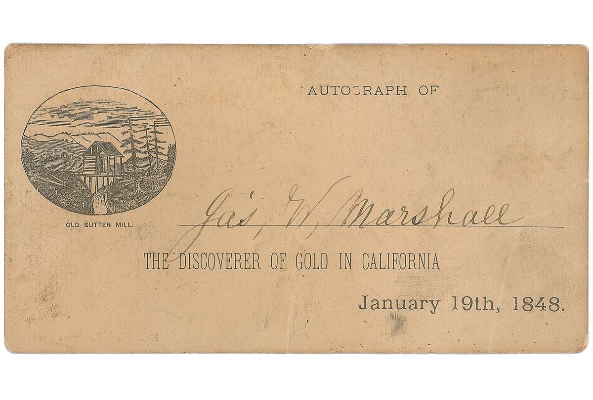 American carpenter (1810–1885) who discovered gold in California’s American River while constructing a mill for John Sutter, setting the stage for the California Gold Rush. Rare ink signature, “Ja’s W. Marshall,” on an off-white 5.25 x 2.75 souvenir autograph card featuring an image of Old Sutter Mill with printed text below reading, “The Discoverer of Gold in California, January 19th, 1848.” In very good condition, with a tear extending from the bottom edge into his middle initial, moderate soiling, and a few creases. Marshall never profited from the discovery and later turned to selling these souvenir cards to supplement his income.