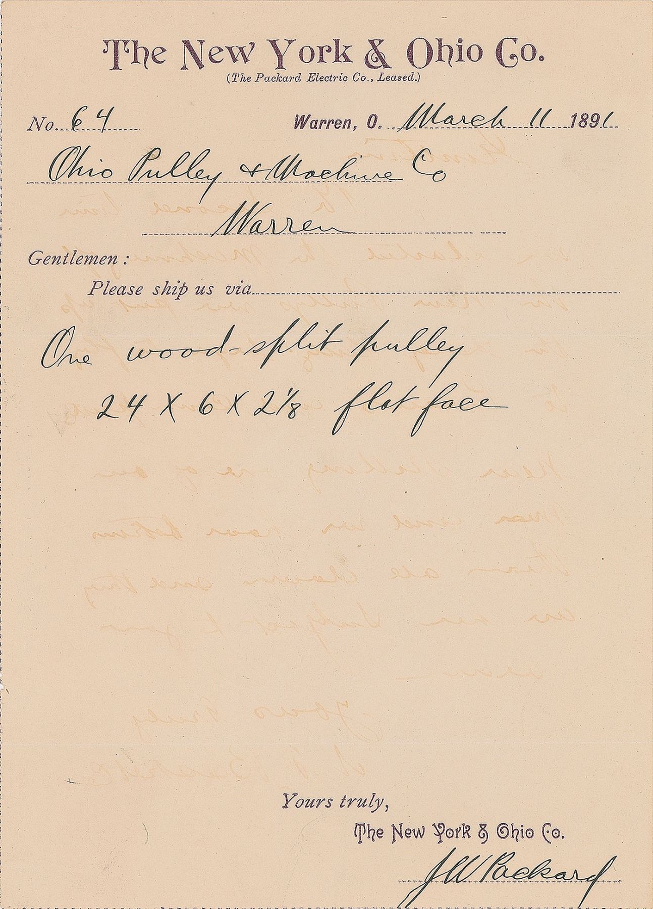 Automobile manufacturer (1863–1928) known for his Packard Motor Car Company, founded in 1899 in Warren, Ohio. ADS signed “J. W. Packard,” one page, 5.25 x 7.5, The New York & Ohio Co. letterhead, March 11, 1891. Partly-printed order form submitted to the Ohio Pulley & Machine Co., filled out in Packard's own hand. Packard requests "One wood-split pulley, 24 x 6 x 2 1/8 flat face." In fine condition, with a light diagonal bend, and faint ghostlike impressions of writing from another item that must have been in contact with this at one time. The New York & Ohio Co. was an electrical manufacturing company owned by James Ward Packard and his brother William Doud Packard. The first Packard motor car would be built at the New York and Ohio plant in 1899, and the brothers incorporated the New York and Ohio Automobile Company in 1900. This would be renamed as the Packard Motor Car Company in 1902, with James Packard as its president. Packard's autograph is extremely rare in any form, with this very early example being just the third we have offered.