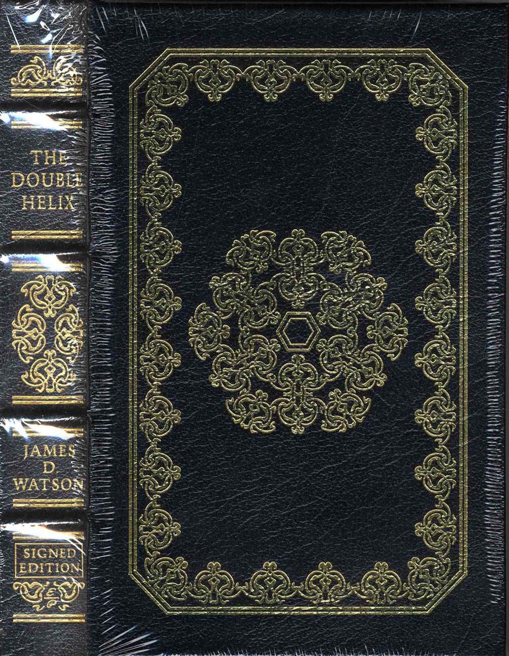 Nobel Prize winning scientist, James D. Watson's signed collector's edition of ''The Double Helix,'' Norwalk, Connecticut: Easton Press: 2009. Black leather book with decorative 22kt gold detailing on cover and page edges. Volume measures 6.5'' x 9.5'' and remains sealed in original shrink wrap. Satin ribbon page marker and smyth-sewn pages. Mint condition.