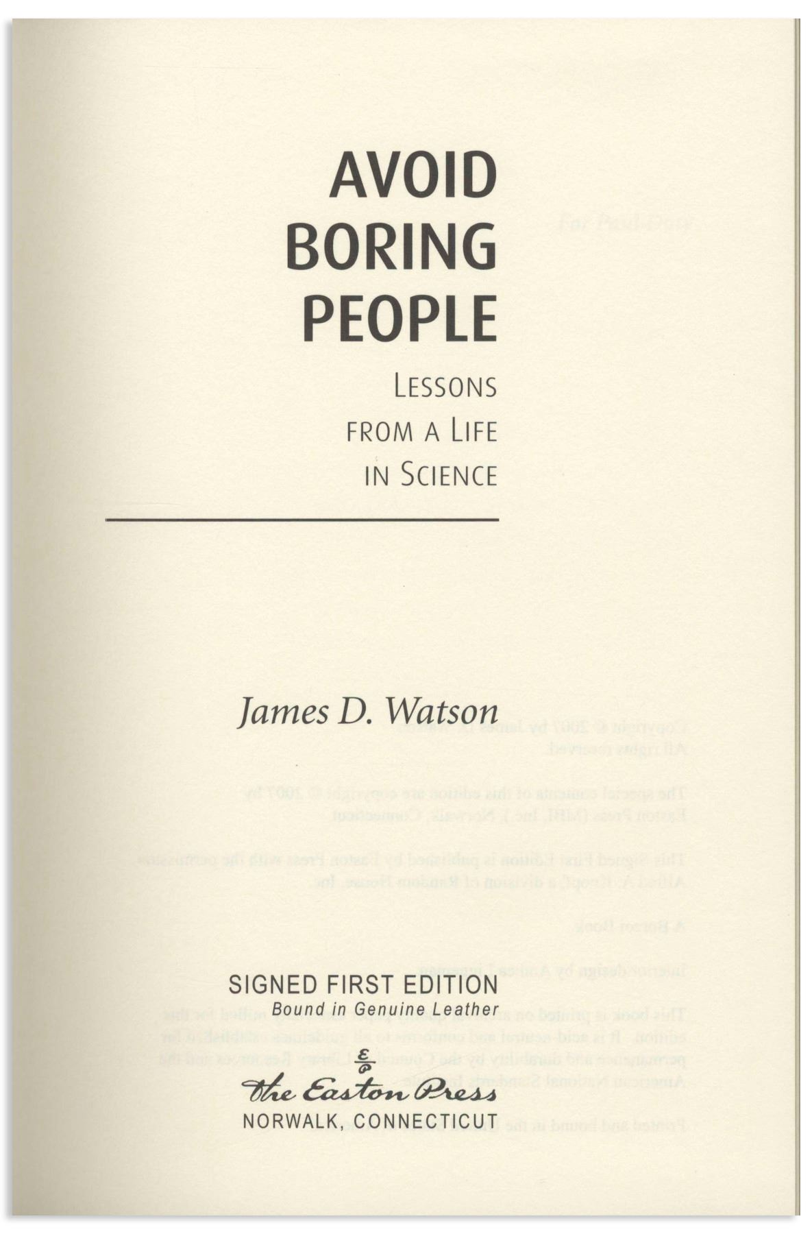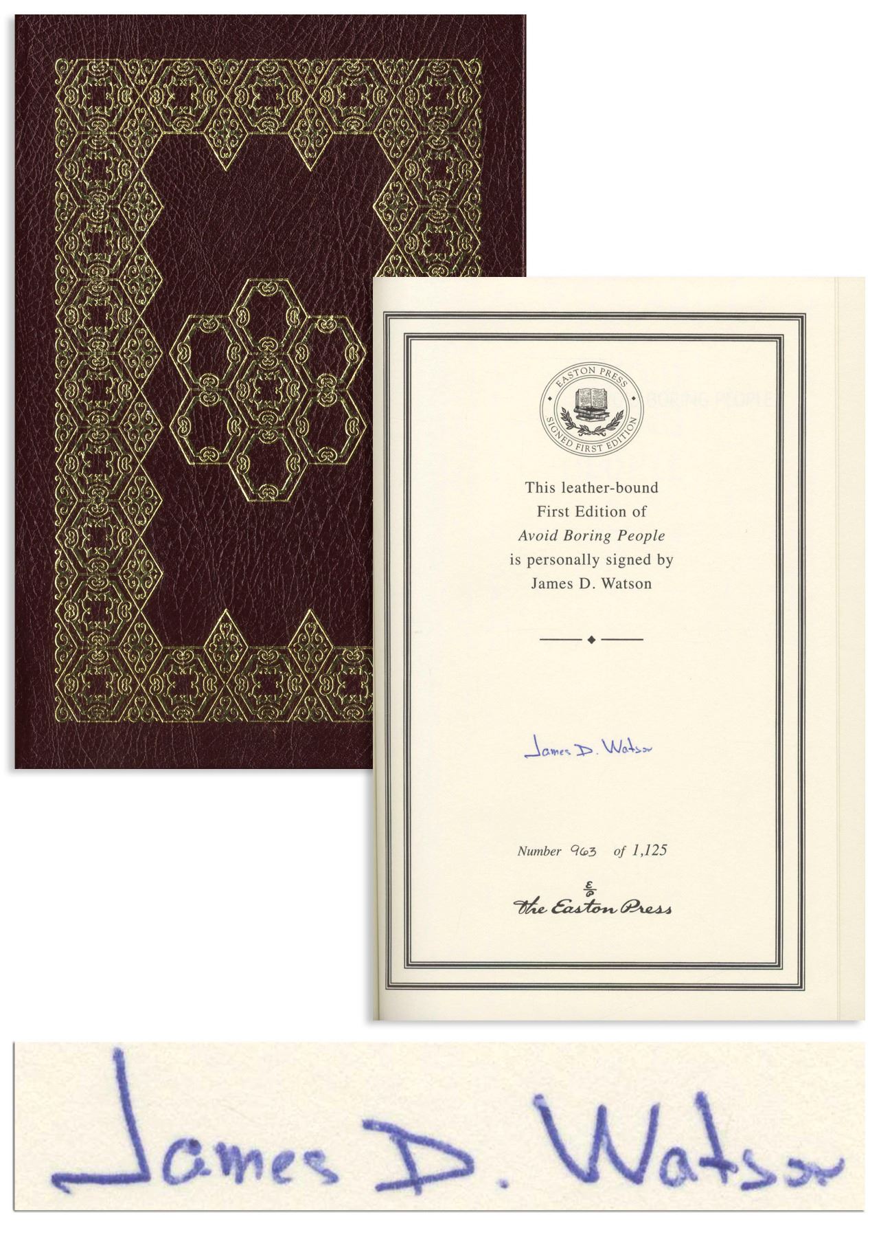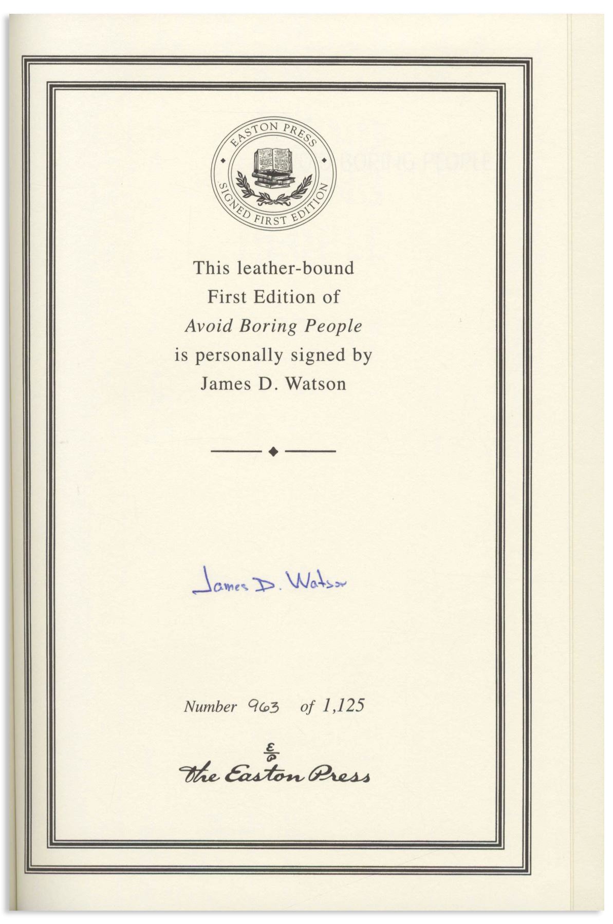 James D. Watson signed limited edition of his memoir, ''Avoid Boring People'', in which the Nobel Prize-winning geneticist stresses the importance of emotional intelligence and social skills for a career in science. Norwalk, CT: Easton Press, 2007. Beautiful deluxe first edition is signed by Watson on the limitation page in blue ballpoint, revealing this as #963 in the limited edition of 1,125. Bound in maroon leather boards, with gilt design, all edges gilt, silk watered endpapers, and satin page marker. Book measures 6.5'' x 9.5''. Fine condition. With accompanying Easton Press COA.
