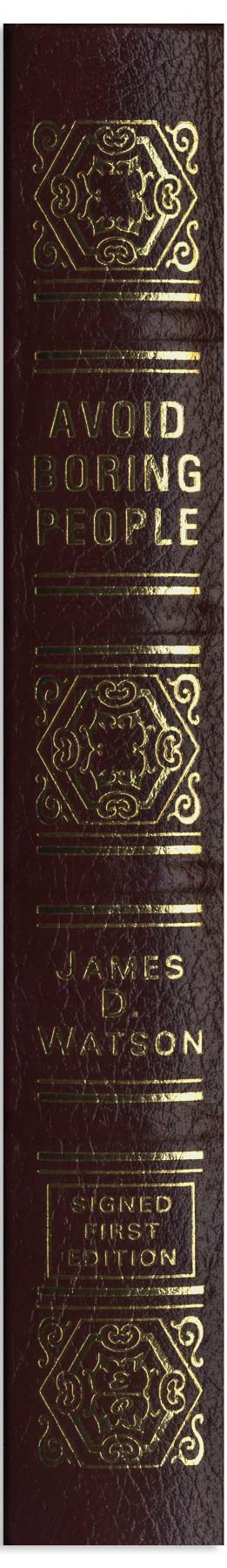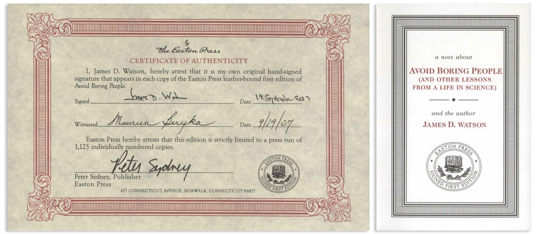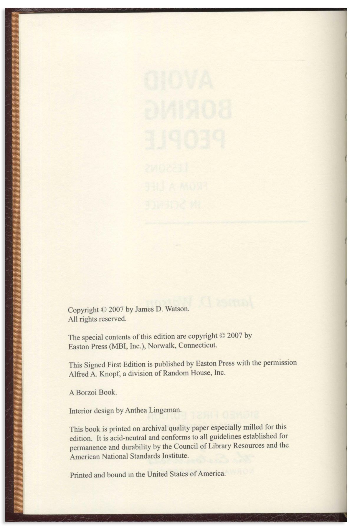 James D. Watson signed limited edition of his memoir, ''Avoid Boring People'', in which the Nobel Prize-winning geneticist stresses the importance of emotional intelligence and social skills for a career in science. Norwalk, CT: Easton Press, 2007. Beautiful deluxe first edition is signed by Watson on the limitation page in blue ballpoint, revealing this as #963 in the limited edition of 1,125. Bound in maroon leather boards, with gilt design, all edges gilt, silk watered endpapers, and satin page marker. Book measures 6.5'' x 9.5''. Fine condition. With accompanying Easton Press COA.