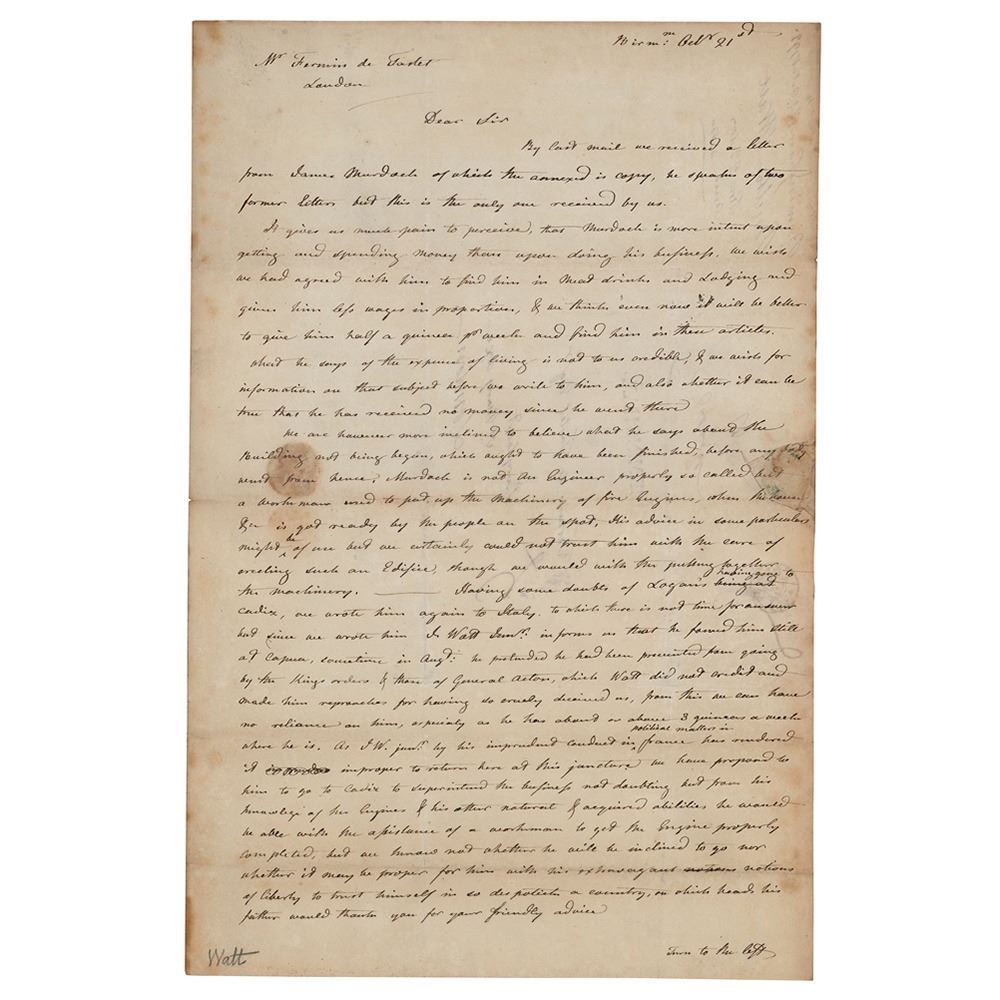 British engineer (1736-1819) who developed an efficient steam engine which was a universal source of power and provided one of the most essential technological components of the early industrial revolution. The unit of power known as a 'watt' was named after him. Large and lengthy ALS signed “Boulton & Watt,†two pages on two adjoining sheets, 10 x 15.5, October 21, 1793. Handwritten letter to the London merchant Fermin de Tastet, concerning the myriad problems encountered while constructing a steam engine-powered sawmill at the docks in Cadiz. Watt's firm of Boulton & Watt had sold a 'sun and planet' steam engine through Fermin de Tastet for the project. Watt first discusses the complaints and observations of engine erector James Murdock, the brother important Boulton & Watt employee William Murdock (inventor of the oscillating cylinder steam engine, gas lighting, and the the pneumatic tube message system), who would be dismissed in 1795 for financial misconduct while at Cadiz. He then discusses the situation of his son, James Watt, Jr., who had recently been denounced in the British parliament for his support of the Jacobins amidst the French Revolution.