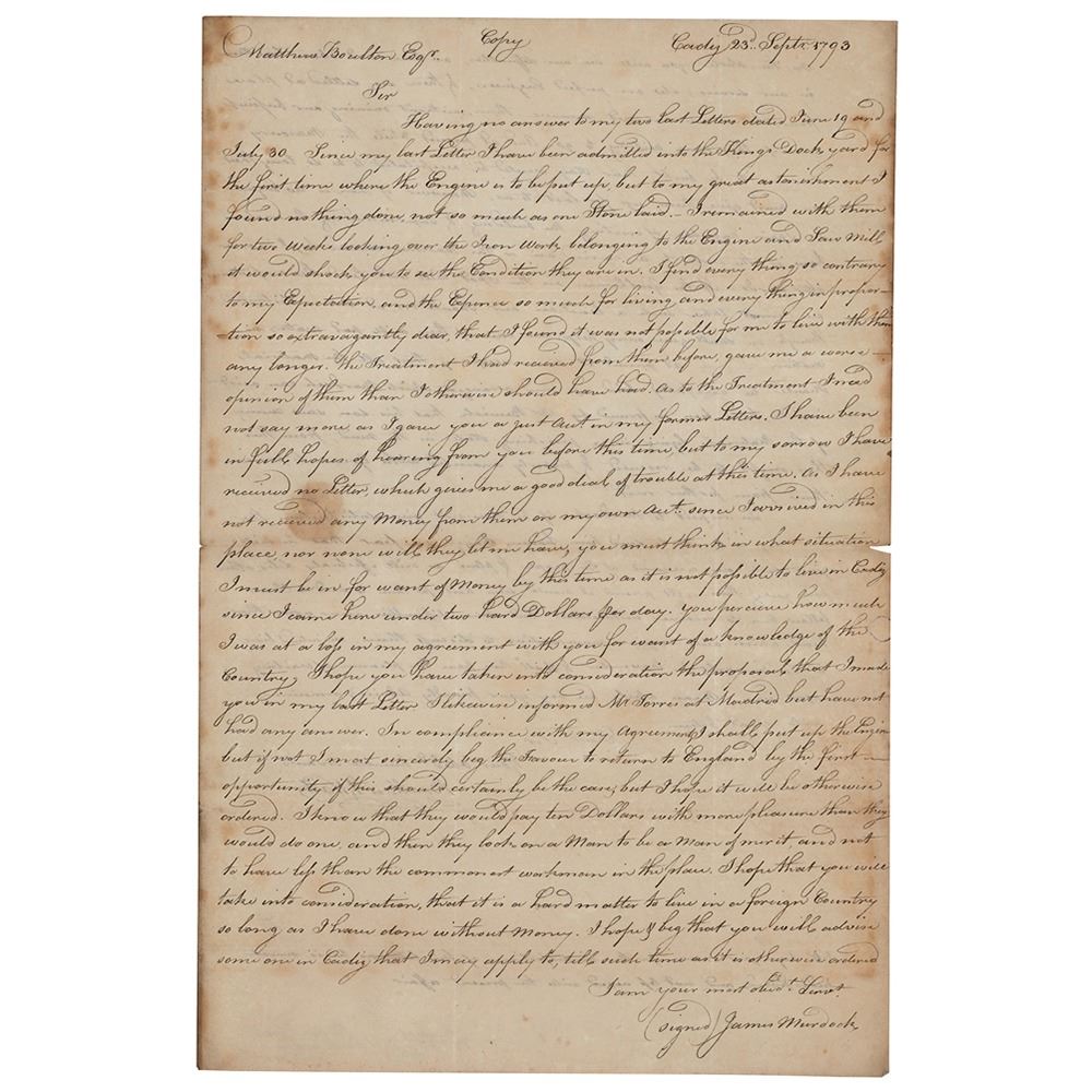 In part: "By last mail we received a letter from James Murdock of which the annexed is copy, he speaks of two former letters but this is the only one received by us. It gives us much pain to perceive, that Murdock is more intent upon getting and spending money than upon doing his business, we wish we had agreed with him to find him in meal drinks and lodging and given him less in wages in proportion…What he says of the expence of living is not credible…We are however more inclined to believe what he says about the building and not being begun, which ought to have been finished, before any body went from hence. Murdock is not an Engineer properly so called but a workman used to put up the machinery of fire engines…His advice in some particulars might be of use but we certainly would not trust him with the care of erecting such an Edifice, though we would with the putting together the machinery…