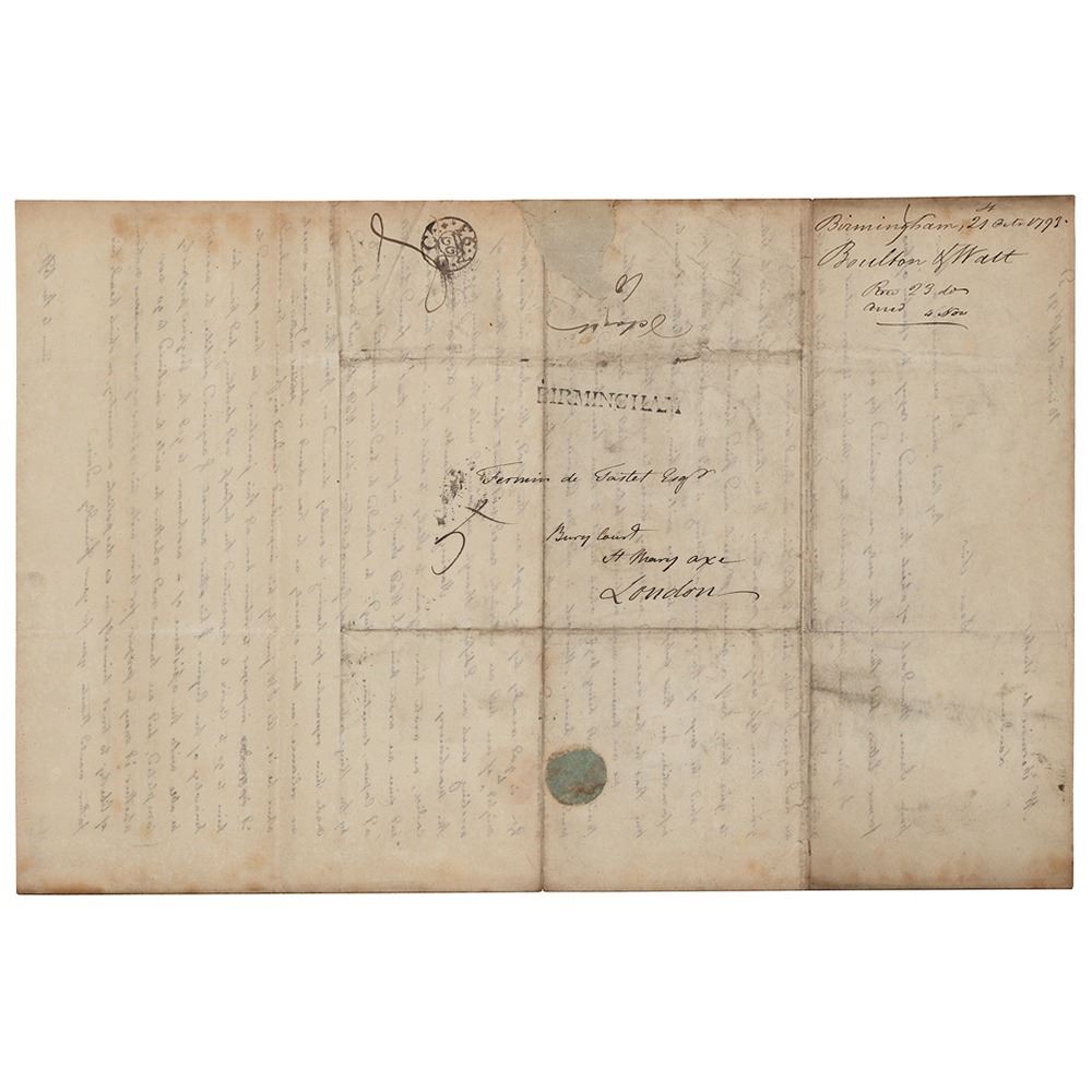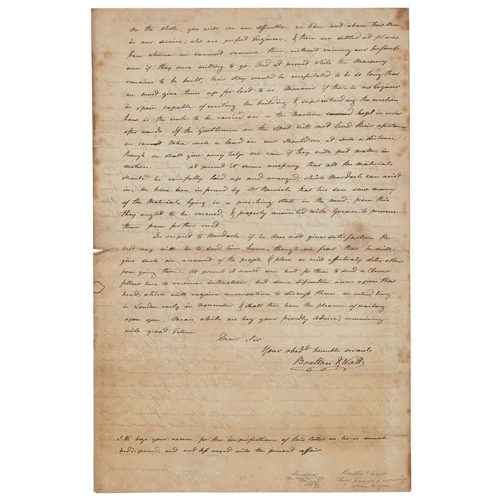 On the whole, you will see our difficulties, we have not above two men in our service, who are perfect Engineers, & there are settles at places from whence we cannot remove them, without ruining our business even if they were willing to go…Moreover if there is no Engineer in Spain capable of erecting the building & superintending the erection how is the work to be carried on or the machine kept in order afterwards…At present it seems necessary that all the materials should be carefully laid up and arranged, which Murdock can assist in, we have been informed by Mr. Bewick that his son saw many of the materials lying in a perishing state in the mud, from this they ought to be rescued, & properly anointed with grease to preserve them from further rust." Watt adds a handwritten postscript, "J.W. begs your excuse for the imperfections of this letter as he is much indisposed, and not less vexed with the present affair." A manuscript copy of Murdock's letter is written opposite the address leaf. In fine condition, with some scattered staining and a rusty circular paperclip impression to the edge.