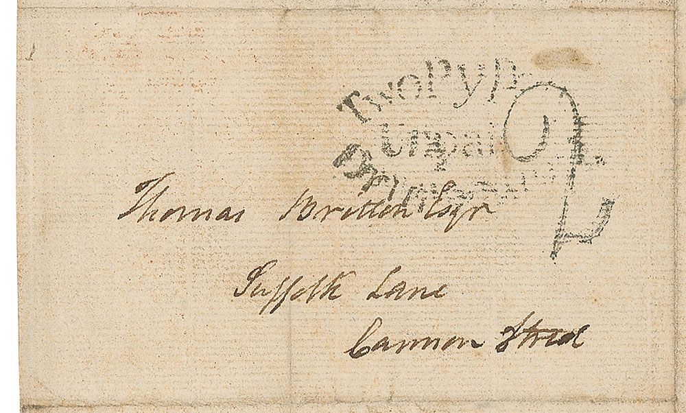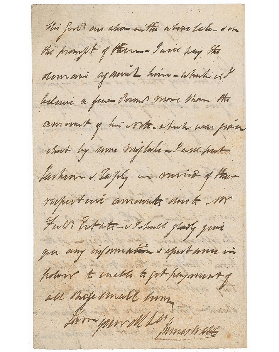 British engineer (1736–1819) who developed an efficient steam engine which was a universal source of power and provided one of the most essential technological components of the early industrial revolution. The unit of power known as a ‘watt’ was named after him. ALS, one page both sides, 4.5 x 7.25, February 3, 1813. Letter to Thomas Britten. In his challenging handwriting, Watt writes regarding the estate of a man named Field; he explains that some family members are in England, others are in India, and that he will arrange to pay off the note. Light show-through from writing to opposing sides, and two areas of paper loss to the adjoining address panel page, otherwise fine condition. In making the Industrial Revolution possible, Watt’s developments altered the economies of continents and brought about tremendous social change. Watt autographic material is exceptionally desirable and rarely comes to market.