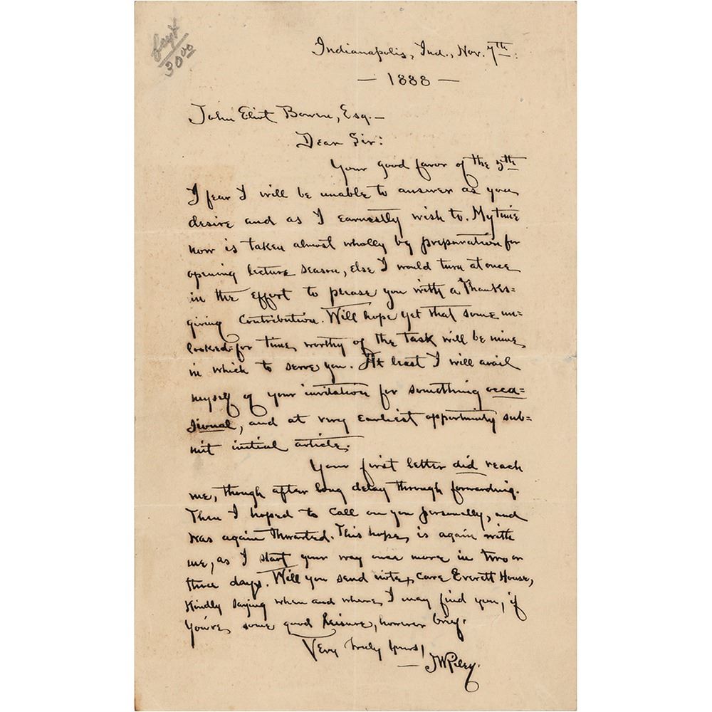 American author and poet (1849-1916) best known for writing in 'Hoosier' dialect and for his children's poems. ALS signed “J. W. Riley,” one page, 5 x 8, November 7, 1888. Handwritten letter to John Eliot Browne, in part: "I fear I will be unable to answer as you desire and as I earnestly wish to. My time now is taken about wholly by preparation for opening lecture season, else I would turn at once in the effort to please you with a Thanksgiving contribution. Will hope yet that some unlooked-for time worthy of the task will be mine in which to serve you." In fine condition.
