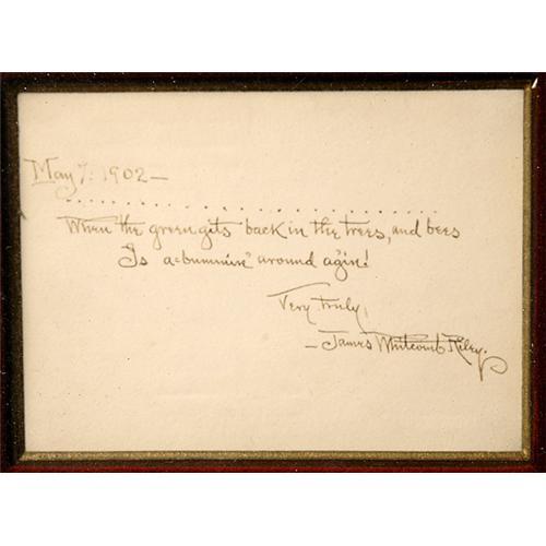 <Our item number 135703><B>Riley, James Whitcomb.</B> (1849-1916) American writer and poet; known as the "Hoosier Poet". Autograph quotation signed, 3 x 4¼ in., n.p., 7 May 1902. Two lines from the poem "When the Green Gits Back in the Trees." Riley often wrote in dialect. Matted with a color image of Riley and framed to an overall size of 15 x 9¼ in. Fine; a few nicks to frame. A COA from the late autograph dealer Charles Hamilton is on the verso. <BR>Estimated Value $200 - 300. <BR><BR>Our item number 135703<BR><IMAGES><P ALIGN="CENTER"><IMG SRC="http://www.goldbergcoins.net/liveauction/49jpegs/135703.jpg"> <BR><IMG SRC="http://www.goldbergcoins.net/liveauction/49jpegs/135703N2.jpg"> <BR><IMG SRC="http://www.goldbergcoins.net/liveauction/49jpegs/135703N3.jpg"> </P></IMAGES>