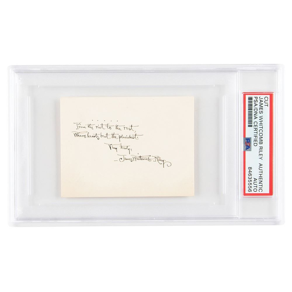 AQS on an off-white 3.5 x 2.5 card, signed below in ink, & ldquo;Very truly, James Whitcomb Riley.& rdquo; The quote, taken from Riley& rsquo;s poem & lsquo;Proem& rsquo; or & lsquo;Afterwhiles,& rsquo; in full: & ldquo;From the riot to the rest, Where hearts beat the placidest.& rdquo; In fine condition. Encapsulated in a PSA/DNA authentication holder.