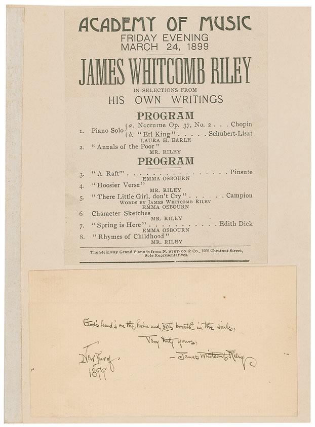 AQS, signed “James Whitcomb Riley,” dated “New Year of 1899,” on an off-white 5.75 x 3.5 slip. In full: “God’s hand’s on the helm and His breath in the sails.” Quote is affixed by its top edge to a 7 x 9.25 off-white sheet with a clipped program page from a March 1899 appearance. In fine condition.