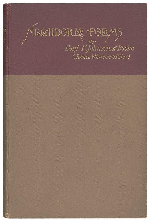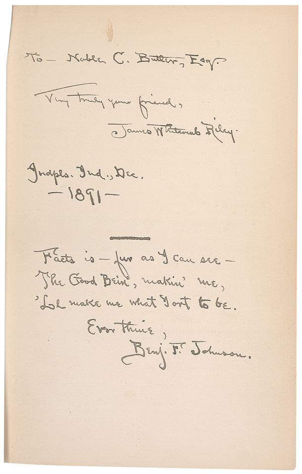 Signed book: Neighborly Poems by Benj. F. Johnson, of Boone (James Whitcomb Riley). Indianapolis, Indiana: The Bowen-Merrill Company, 1891. Hardcover, 5 x 7.5, 90 pages. Signed on the second free end page “To Noble C. Butler, Esq, Very truly your friend, James Whitcomb Riley, Indpls, Ind,. Dec. 1891” and adding a stanza “Fact is—far as I can see—The Good Bein’ makin’ me, ‘Ll make me what I art to be. Ever thine, Benj. F. Johnson.” In fine condition, with partial separation of the first free end page along the hinge, some toning to the edges, and scattered soiling to the boards. Accompanied by two news articles from March 1966. According to the articles, the book was one of five publications found in the stacks of Shortridge High School in Indiana that carried Riley’s signature and notation; Benjamin F. Johnson was an early pen name used by Riley.