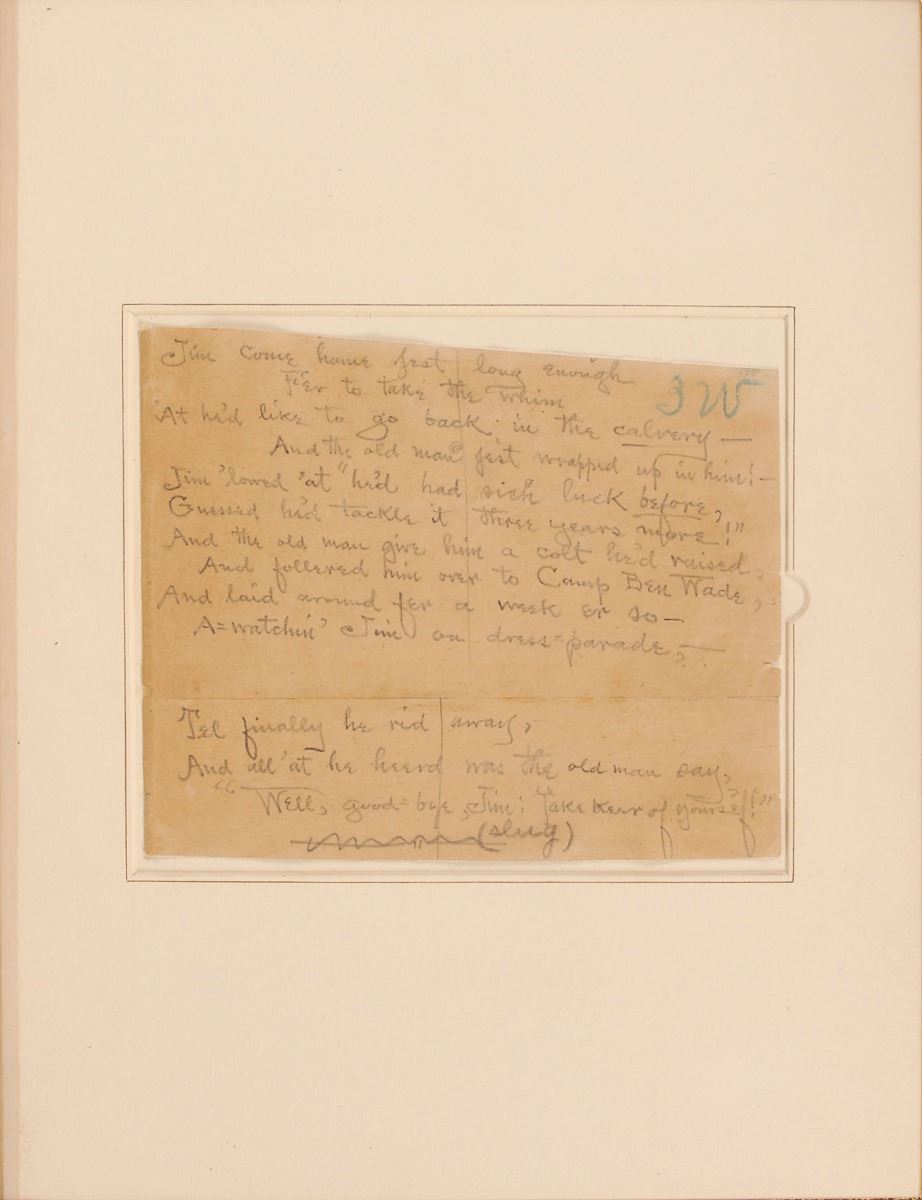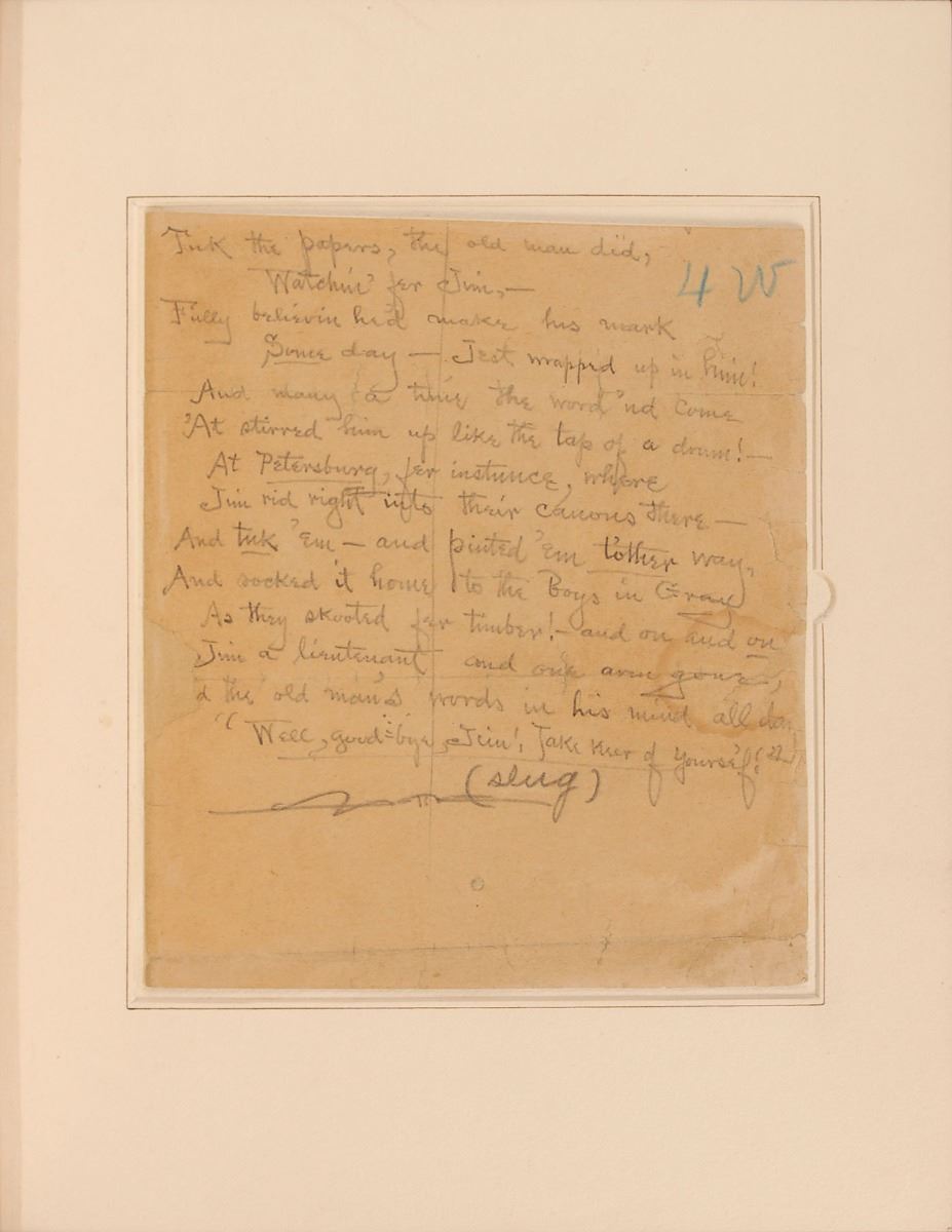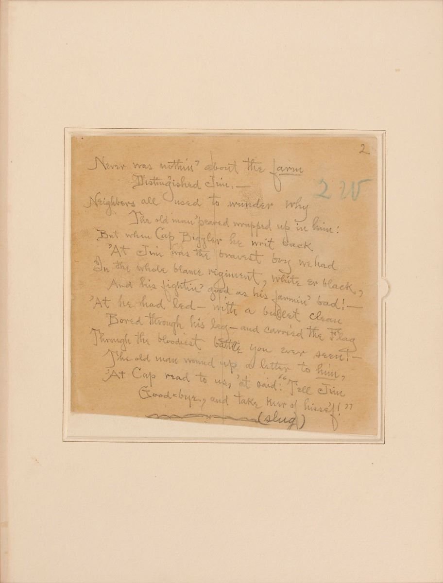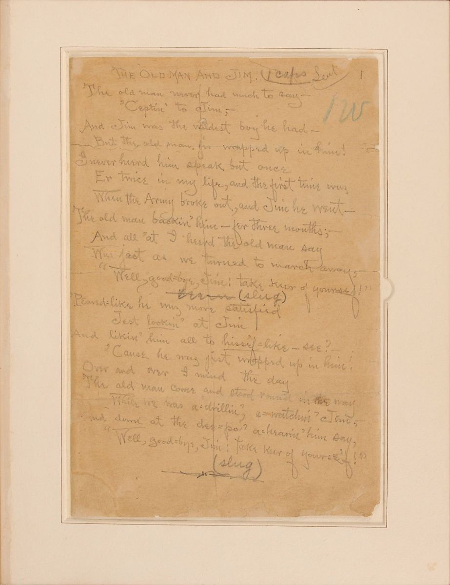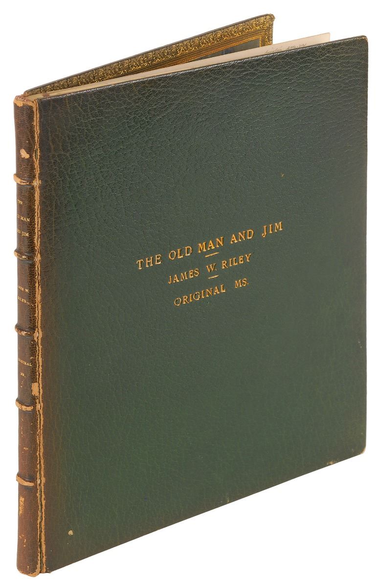Handwritten manuscript in pencil, unsigned, four pages, no date. The first five stanzas of Riley’s popular poem “The Old Man and Jim,” with each page affixed at the edge to a mat board, custom bound in full green morocco leather by Riviere and Son. The poem begins: “The old man never had much to say—, ’Ceptin’ to Jim,—, And Jim was the wildest boy he had—, But the old man jes’ wrapped up in him!, I never heerd him speak but once, Er twice in my life, and first time was, When the army broke out, and Jim he went—, The old man backin’ him—fer three months;—, And all ’at I heerd the old man say, Wus jes’ as we turned to march away—, ‘Well, good-bye, Jim: Take keer of yourse’f!” Annotated in another hand, presumably to direct the printing process. In very good condition, with toning, trimming, tears, and areas of restored paper loss along edges. This was one of Riley’s favorite poems and was submitted by him for publication in The Century Magazine in 1887.