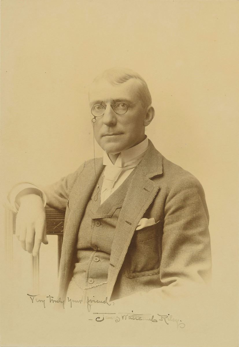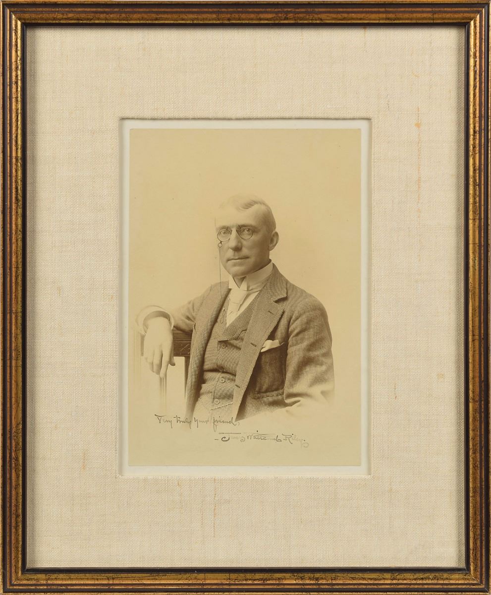 Vintage matte-finish 5.25 x 7.5 portrait of Riley in a distinguished half-length pose, signed in black ink, "Very truly your friend—James Whitcomb Riley." Cloth-matted and framed to an overall size of 11 x 13.5. In fine condition.
