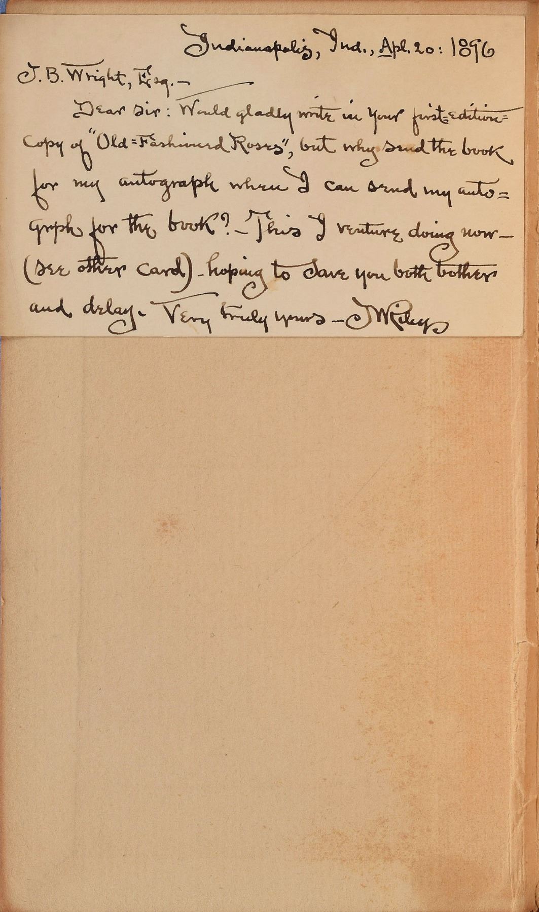 ALS signed “J. W. Riley,” one page, 3.75 x 2.25, April 20, 1896. Letter to J. B. Wright, in full: "Would gladly write in your first edition copy of 'Old-Fashioned Roses,' but why send the book for my autograph when I can send my autograph for the book?—This I venture doing now—(see other card)—hoping to save you both bother and delay." The letter is affixed to the front pastedown of a fourth edition hardcover copy of Old-Fashioned Roses, published in London by Longmans, Green, and Co., in 1892. In fine condition.