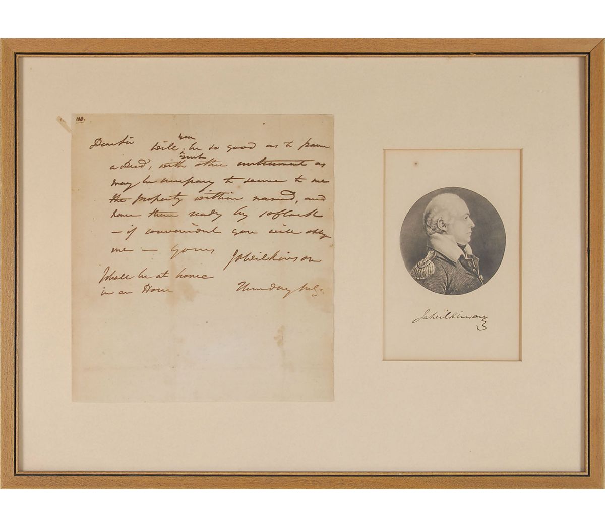 American soldier and statesman (1757–1825) associated with several scandals and controversies, who after his death was discovered to have been a paid agent of the Spanish Crown. ALS signed “Ja. Wilkinson,” one page, 7.75 x 8.25, no date. Letter to a gentleman concerning a deed, regarding documents that “may be necessary to secure to me the property within named.” Mounted and framed against a mat with an engraved portrait of Wilkinson to an overall size of 17.75 x 13. In fine condition, with intersecting folds and scattered staining.
