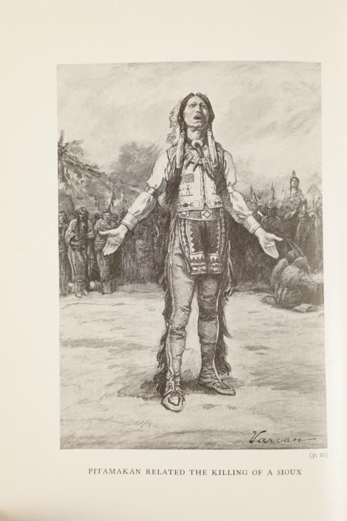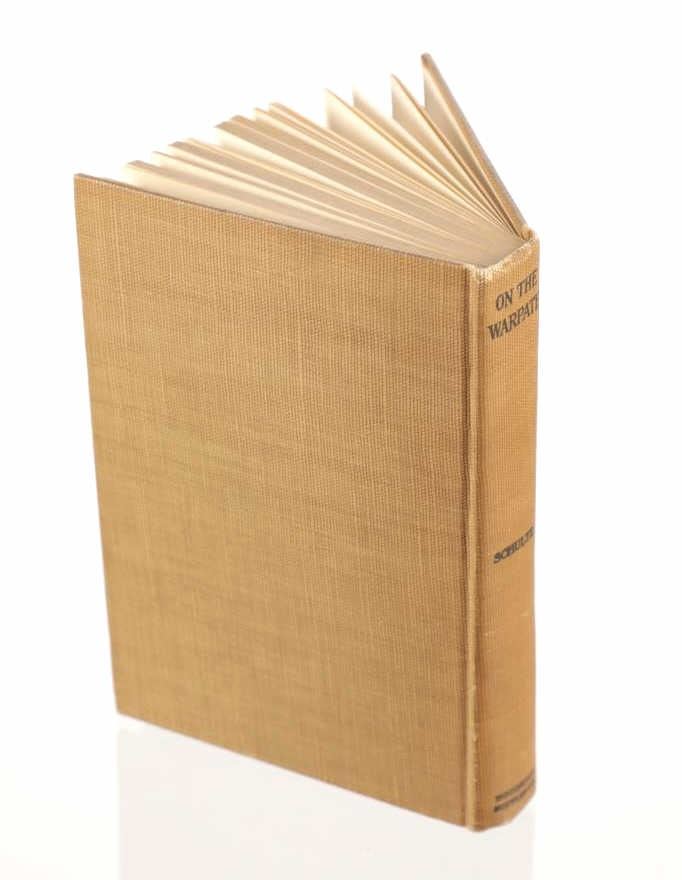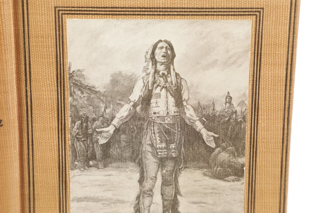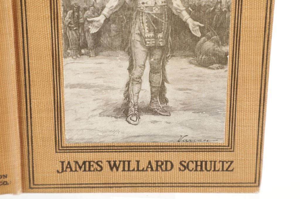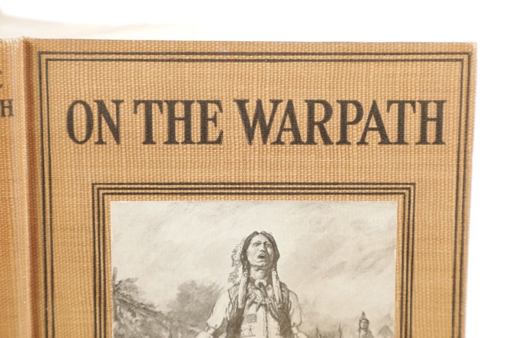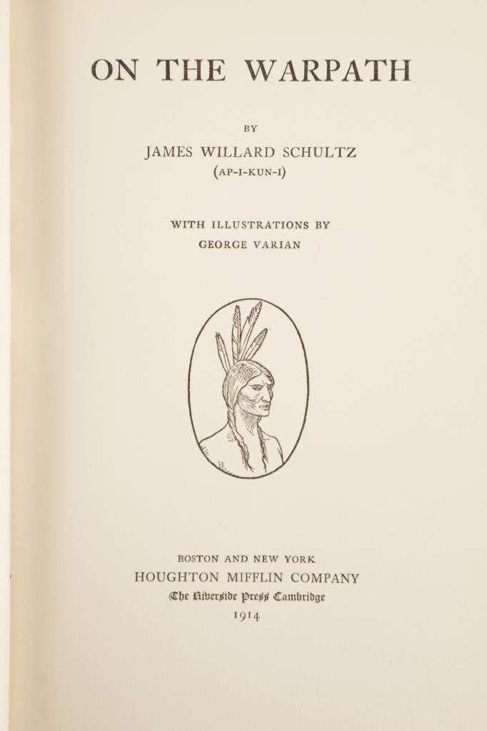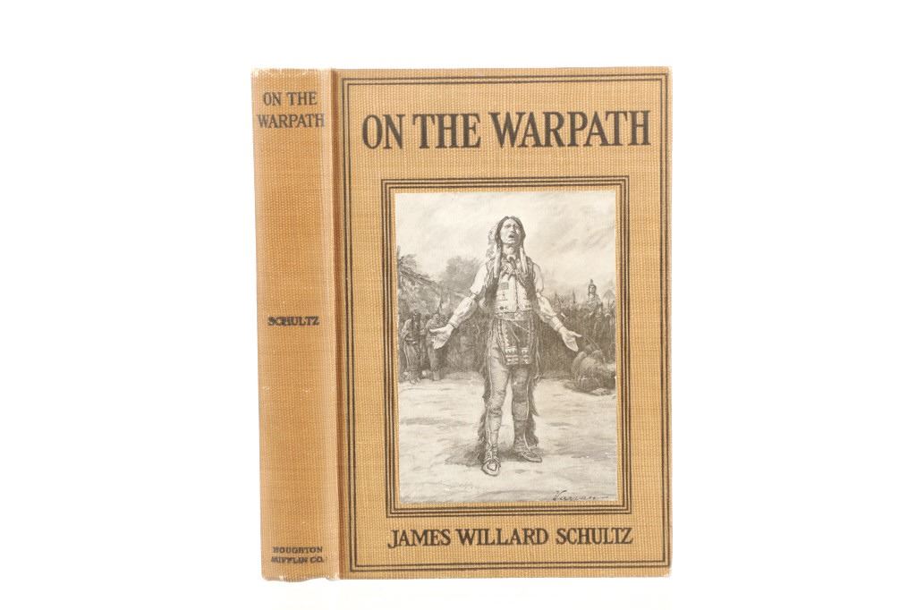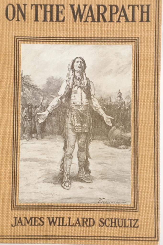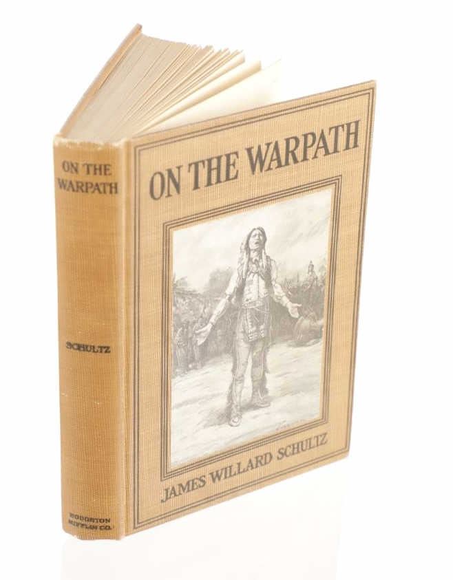 For your consideration is a Rare, 1914 First Edition of "On The Warpath", by James Willard Schultz, publisher Houghton Mifflin Company, The Riverside Press, illustrated by George Varian. This book features a story of living among Native Americans in Montana. Schultz lived with the Blackfeet, married a Piegan woman, and wrote in detail about his experiences. The Northern Piegan band of the Blackfeet Nation are the modern Indian tribe usually associated with Glacier National Park. Schultz gave Blackfeet names to geographic features in the park. It was the writings of James Willard Schultz that first enticed George Bird Grinnell to the area in 1885. Grinnell later helped to establish the park in 1910. James Willard Schultz, or Apikuni, (August 26, 1859 – June 11, 1947) was an American author, explorer, Glacier National Park guide, fur trader and historian of the Blackfeet Indians. He operated a fur trading post at Carroll, Montana and lived among the Pikuni tribe during the period 1880-82. He was given the name Apikuni by the Pikuni chief, Running Crane. Apikuni in Blackfeet means "Spotted Robe." Schultz is most noted for his 37 books, most about Blackfoot life, and for his contributions to the naming of prominent features in Glacier National Park. The tan clothbound hardcover is in nice condition, front cover has the same George Varian illustration also located on the frontispiece. Very slight scuffing observed on cover edges, intact pages exhibit slight age tanning, no other marring observed. Measures 5.5"W x 8"L x 1"D, weight approximate 1lb, 4oz.