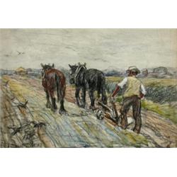 James William Booth, RCA(1867-1953)The Plough Team, signed lower left "J W Booth, RCA", crayon with watercolour, 31 x 44cm £400-500