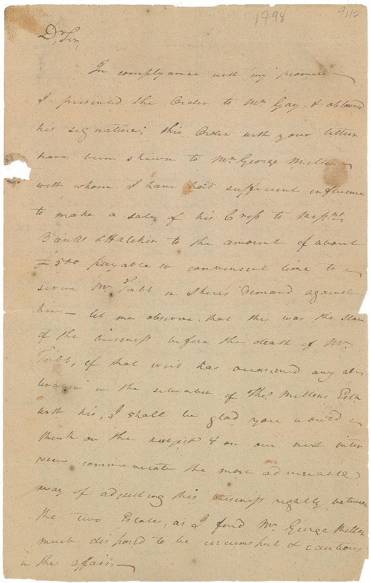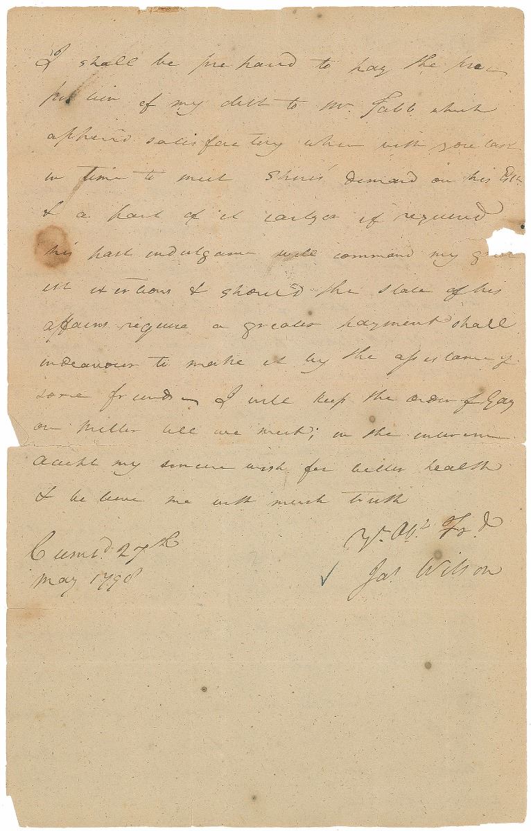Signer of the Declaration of Independence from Pennsylvania (1742–1798), and one of only six men who signed both the Declaration and the US Constitution. ALS signed “Jas. Wilson,” one page both sides, 7.5 x 12, May 27, 1798. Letter to Hon. William B. Giles. In part: “In compliance with my promise—I presented the Order to Mr. Gray…this Order with your letters have been shewn to Mr. George Miller—with whom I have had sufficient influence to make a sale of his Crop to Messrs. Banks & Hatcher to the amount of about 500 pounds payable in convenient time…I shall be glad if you would think on the subject and on our next interview communicate the most admirable way of adjusting this business rightly between the two Estates, as I find Mr. George Miller much disposed to be circumspect & cautious in the affairs.” In very good condition, with tears and splits to folds and seal-related paper loss. Accompanied by the original address leaf addressed in Wilson’s hand.