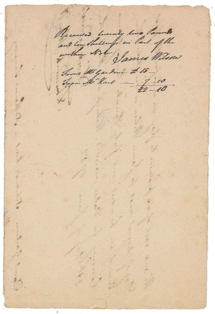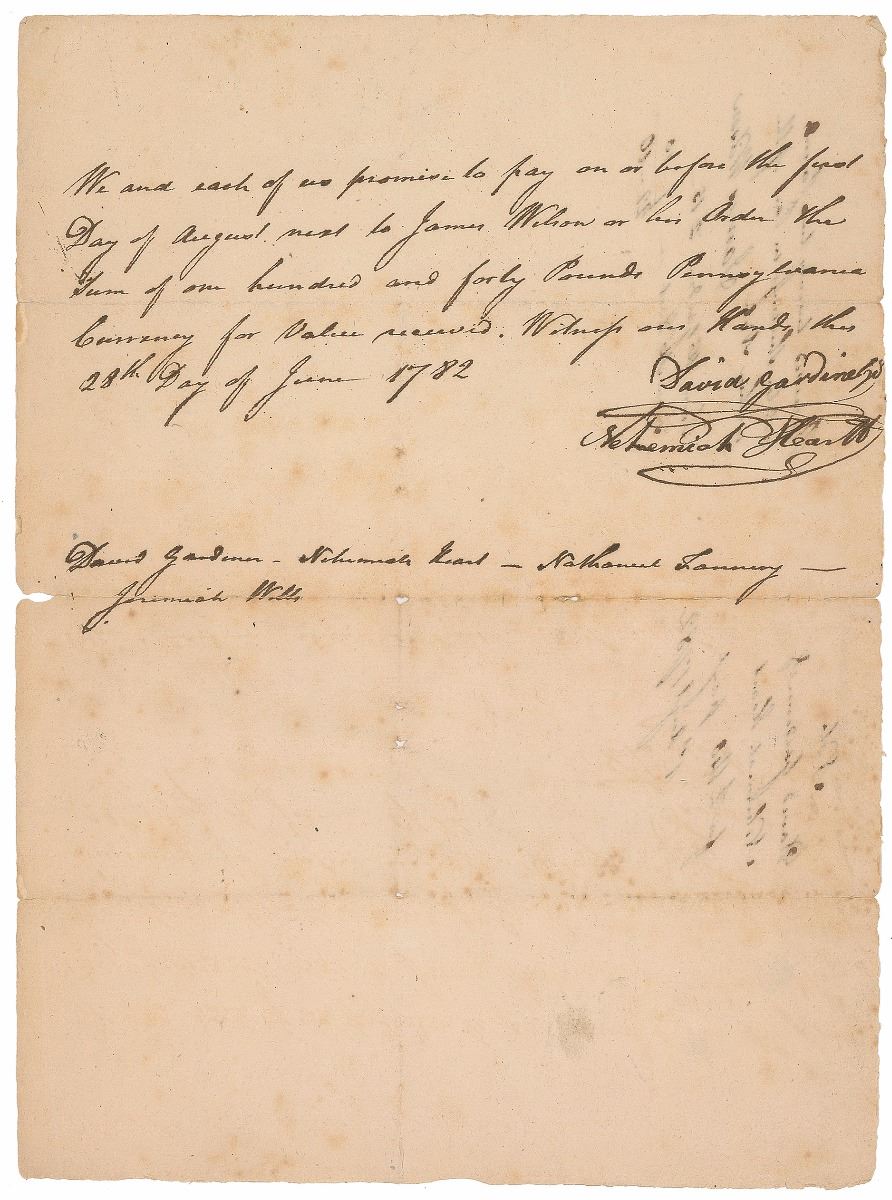 Signer of the Declaration of Independence from Pennsylvania (1742–1798), and one of only six men who signed both the Declaration and the US Constitution. Manuscript DS, one page, 5.5 x 8, June 28, 1782. Promissory note, in part: “We and each of us promise to pay on or before the first Day of August next to James Wilson or his Order the Sum of one hundred and forty Pounds Pennsylvania Currency for Value received.” Docketed and signed on the reverse by Wilson, “Received twenty two Pounds and ten Shillings in part of the written Note, James Wilson.” In very good condition, with splitting along horizontal folds, scattered foxing, and writing showing through from opposing sides.