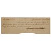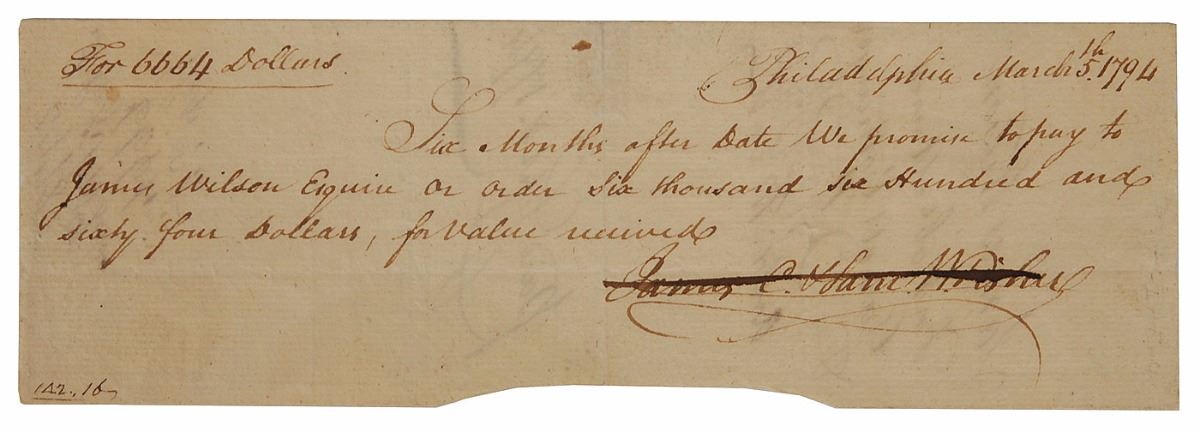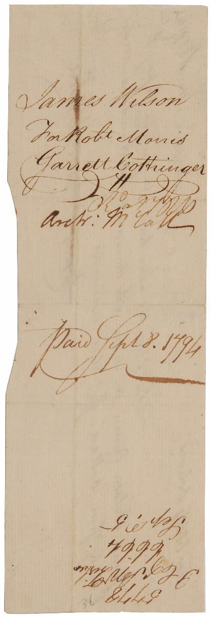 Signer of the Declaration of Independence from Pennsylvania (1742–1798), and one of only six men who signed both the Declaration and the US Constitution. Manuscript DS, one page both sides, 2.5 x 7.75, March 5, 1794. A promissory note, in full: “Six months after date We promise to pay to James Wilson Esquire or order Six thousand six Hundred and sixty four dollars, for value received.” Endorsed on the reverse in black ink, “James Wilson, For Rob’t Morris, Garrett Cottinger.” Removably encapsulated in a mylar sleeve and in fine condition. The mention of “Rob’t Morris” is likely in reference to fellow Pennsylvania signer and noted Revolution financier Robert Morris, a longtime associate who partnered with Wilson in directing the newly founded Bank of North America in 1781. Pre-certified PSA/DNA.