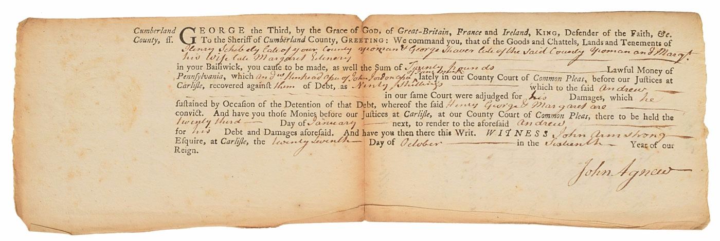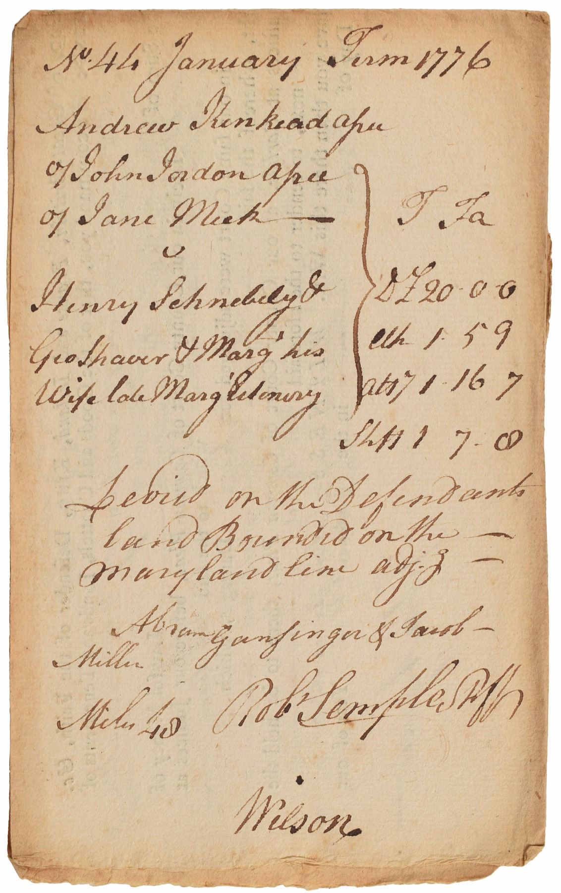 Signer of the Declaration of Independence from Pennsylvania (1742-1798), and one of only six men who signed both the Declaration and the US Constitution. Ink endorsement signature, "Wilson," on the reverse of a partly-printed legal document, one page, 13.5 x 4.25, October 27, 1776. The document concerns a debt payment between Andrew Schnebily, George and Margaret Shaver, and Andrew Kinkead. Several clerical notations dated January 1776 appear above Wilson's signature. In fine condition, with some light toning and foxing.