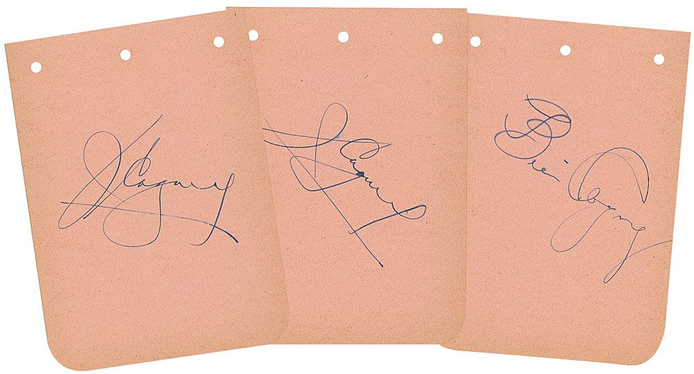 Two vintage fountain pen signatures, “J. Cagney,” and one “Bill Cagney,” on individual beige-colored 6 x 4.5 album pages. In overall fine condition.
