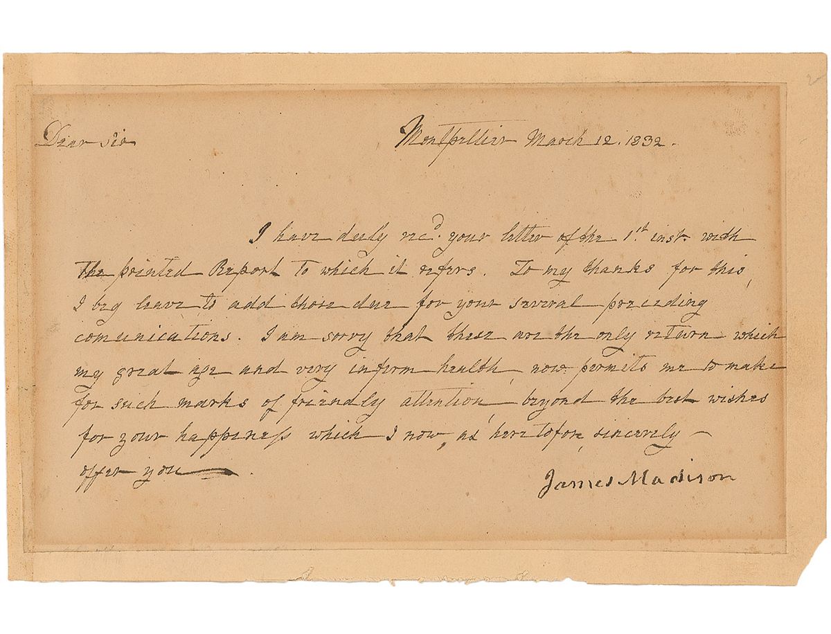 LS, written in the hand of his wife Dolley, one page, 7 x 4.5, March 12, 1832. Letter to an unidentified recipient. In full: “I have duly rec’d your letter of the 1st inst. with the printed report to which it refers. To my thanks for this, I beg leave to add those due for your several proceeding communications. I am sorry that these are the only return which my great age and very infirm health now permit me to make for such marks of friendly attention beyond the best wishes for your happiness.” Letter is inlaid to a 7.75 x 5 off-white sheet. In fine condition, with light toning to edges and a bit of scattered light foxing. A scarce format of the first couple, written from their tobacco estate at Montpelier.
