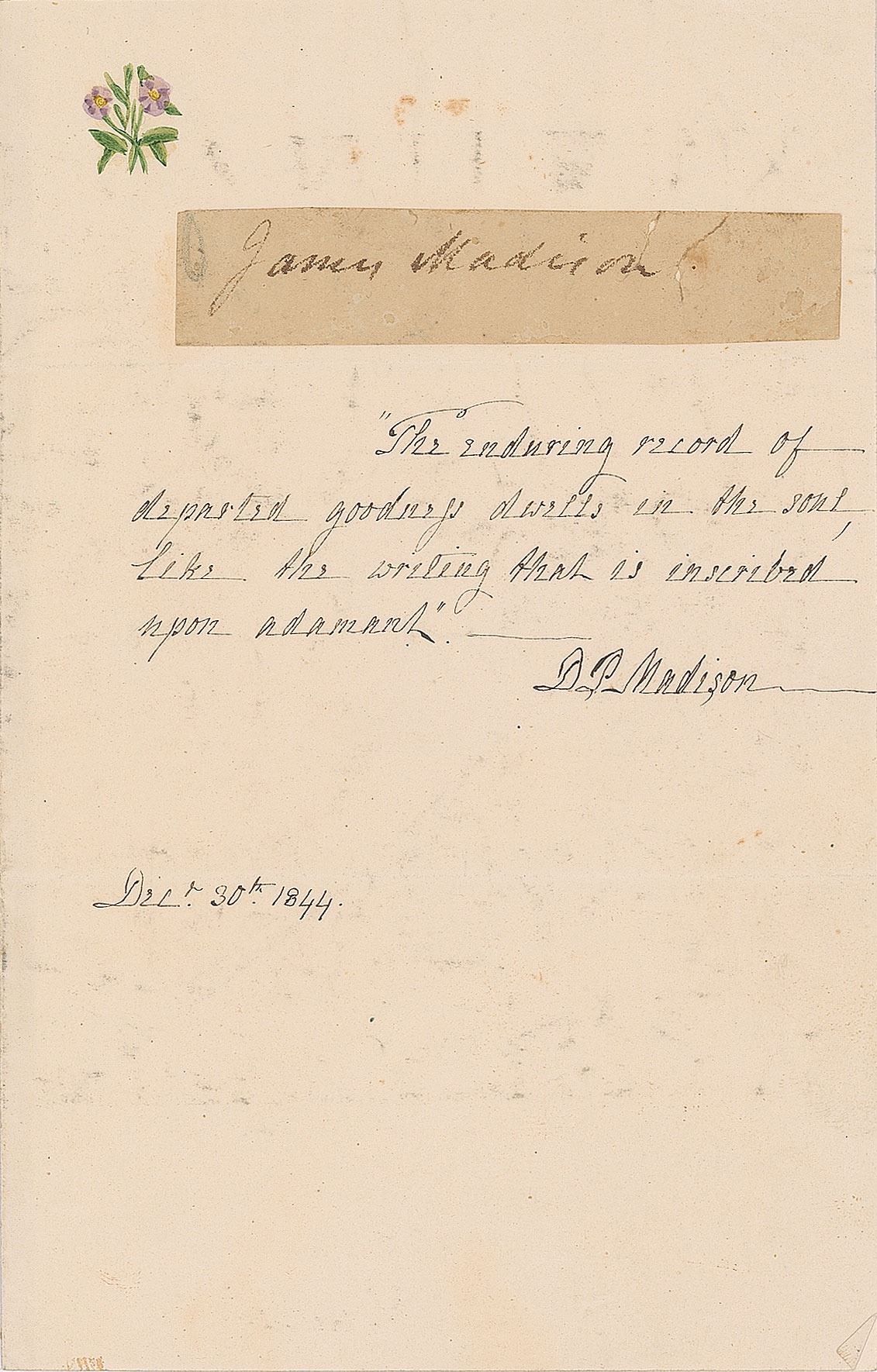 Two items: an AQS from Dolley Madison on an off-white 4.25 x 6.5 stationery sheet, which is signed "D. P. Madison," dated December 30, 1844, and reads: "'The enduring record of departed goodness dwells in the soul, like the writing that is inscribed upon adamant.'" The second item is an ink signature, "James Madison," on an off-white 3.25 x .5 slip that is affixed to the upper portion of the AQS. In overall fine condition, with some minor soiling.