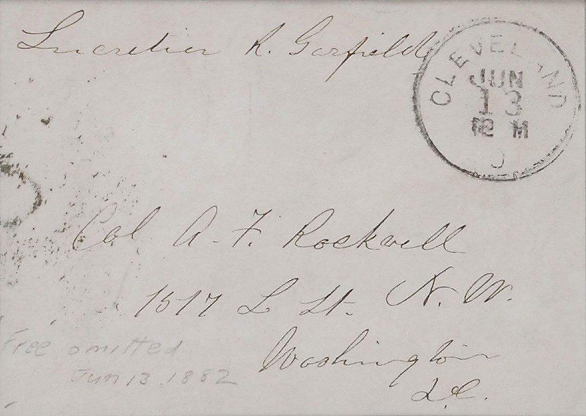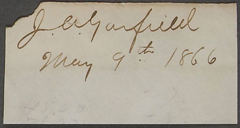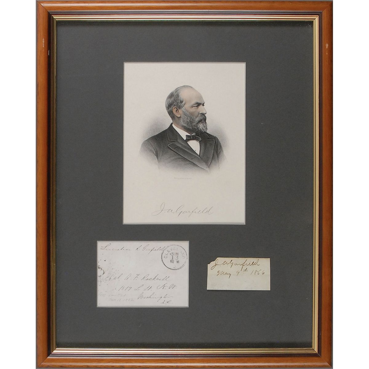 Ink signature, “J. A. Garfield, May 9th 1866”; and a franking signature, “Lucretia R. Garfield,” on a mailing panel addressed in her hand to Colonel A. F. Rockwell. Both are matted and framed with a color engraved portrait of Garfield to an overall size of 12.5 x 15.5. Scattered light soiling and pencil notations to both, and missing top left corner to James’s slip, otherwise fine condition.
