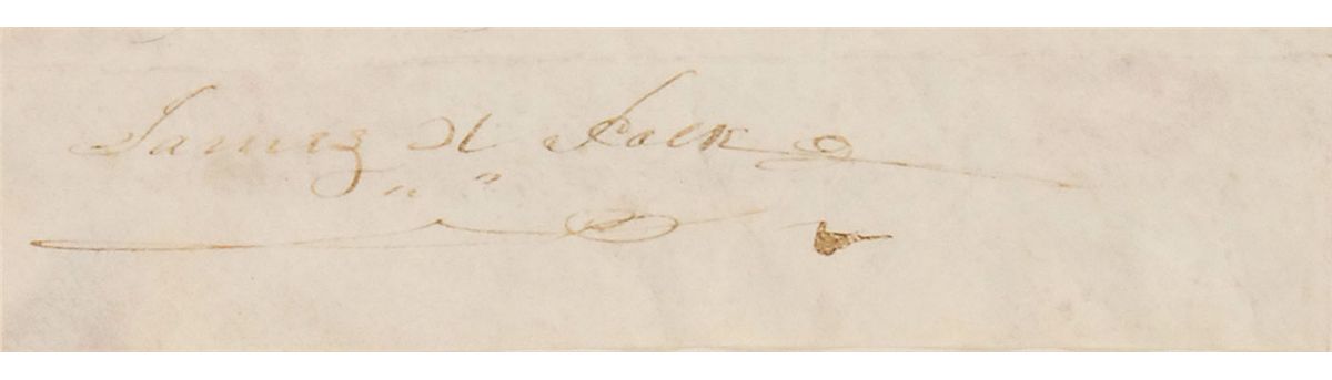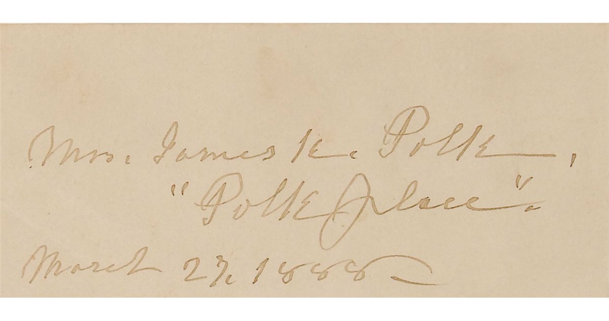Ink signature, “James K. Polk,” on a 4 x 1 off-white slip; and an ink signature, “Mrs. James K. Polk, ‘Polk Place,’ March 27, 1888,” on a 4.25 x 2 off-white slip. Both are affixed to a mat and framed with an engraved portrait of Polk to an overall size of 10.75 x 14.75. In very good condition, with James’s signature fairly light, but still legible, moderate creasing to James’s signature and uniform toning to Sarah’s slip.