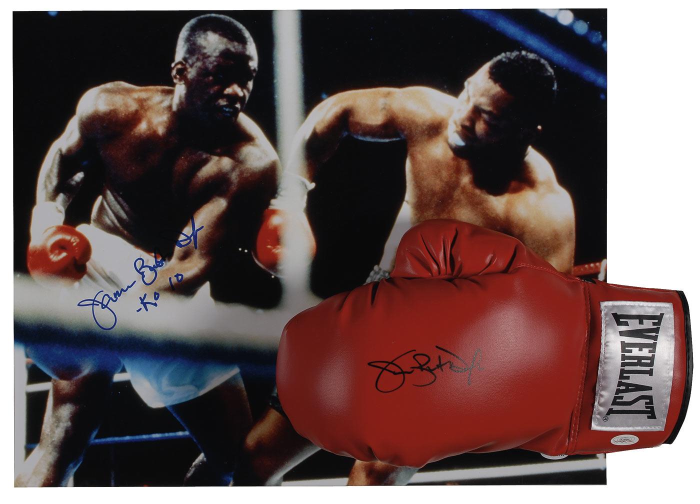 Two items: color satin-finish 20 x 16 photo of Douglas knocking out Mike Tyson, signed in blue felt tip, “James ‘Buster’ Douglas, KO 10,” and accompanied by a certificate of authenticity from PSA/DNA; and an Everlast left-handed 10-ounce boxing glove, signed in blue felt tip. In fine condition, with a James Spence authentication label affixed to glove. RRAuction COA.