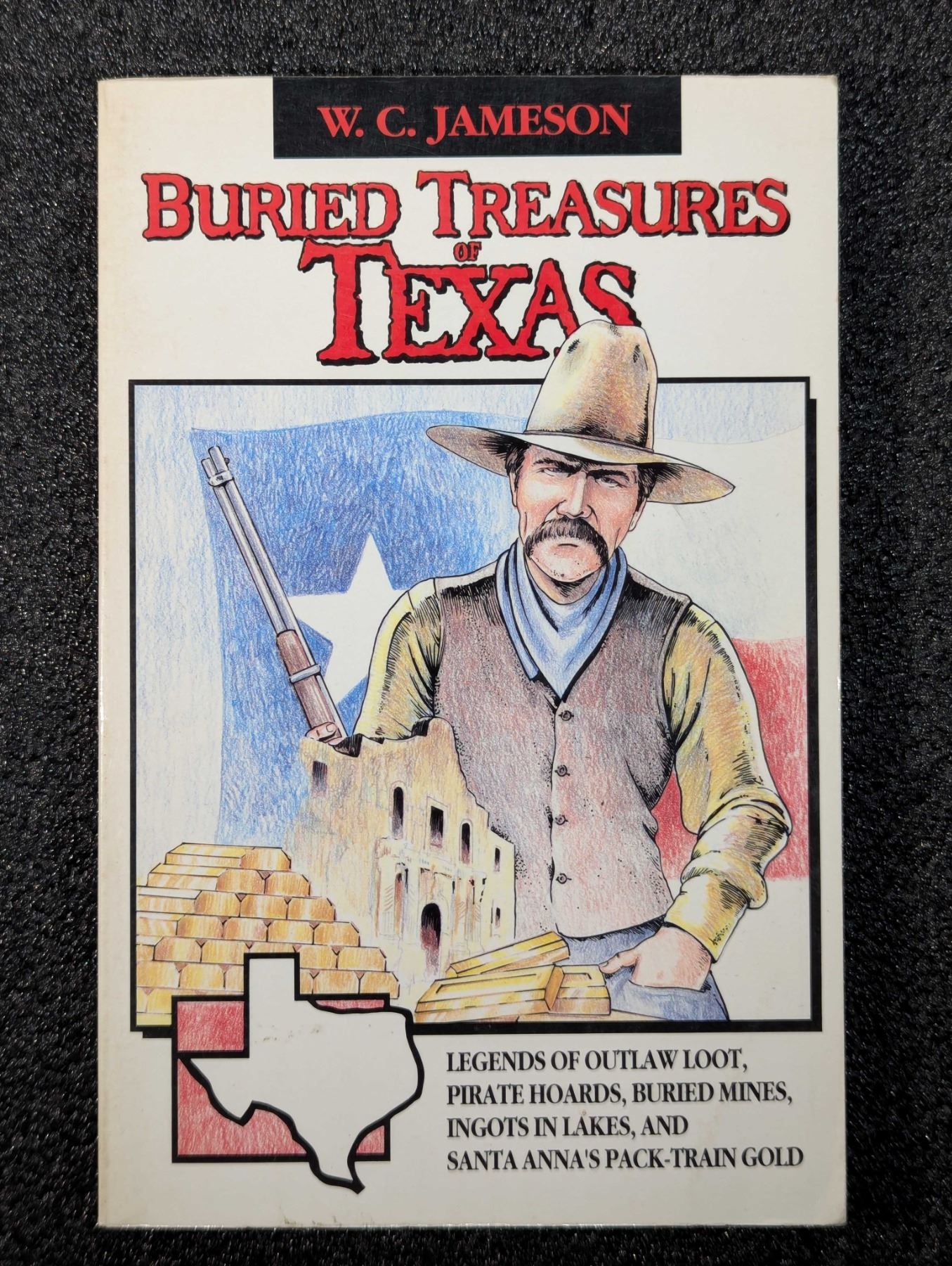 Jameson, W.C. BURIED TREASURES OF TEXAS - LEGENDS OF OUTLAW LOOT, PIRATE HOARDS, BURIED MINES, INGOTS IN LAKES, AND SANTA ANNA'S PACK-TRAIN GOLD. August House Publishers, Little Rock. 1991. 12mo. 202 pages. original pictorial card covers. Maps. Bibliography. English text.Fine. Lot weight: 0 lbs 10oz. Subject(s): Buried Treasure.