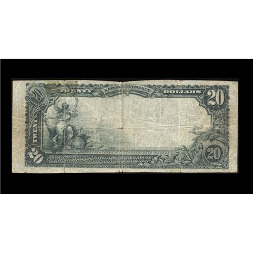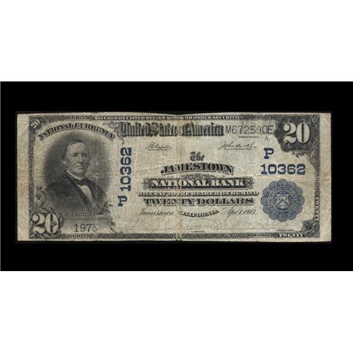 <B>Jamestown, CA</B></I> - $20 1902 Plain Back Fr. 656 <B>The Jamestown NB</B></I> Ch. # (P)10362<BR>An excessively rare note from the only bank in this rural Tuolumne County location. Three notes are known from here, two serial number ones, both now in very strong hands and unlikely to see the light of day for many years, and this example which is Ex-Horwedel. It's a very decent circulated piece, grading Fine, with a couple of repaired splits which can only be seen under careful inspection. As this offering may well be the last from here for years or even decades, any estimate is but a guess, but based on rarity and desirability our feeling is that the hammer will drop with bidding likely in the range of...