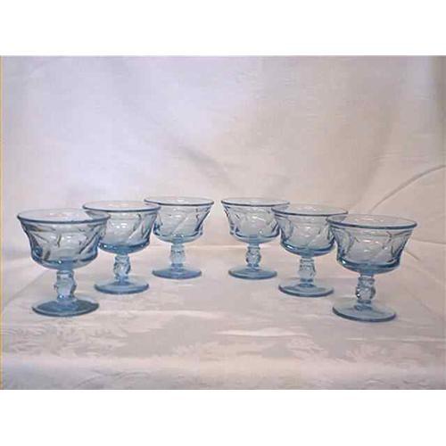 Jamestown Fostoria azure blue sherbets they are hard to find in this beautiful swirl they measure 4.5 inches high. The glasses are in excellent condition with no chips or cracks. Set of 6.