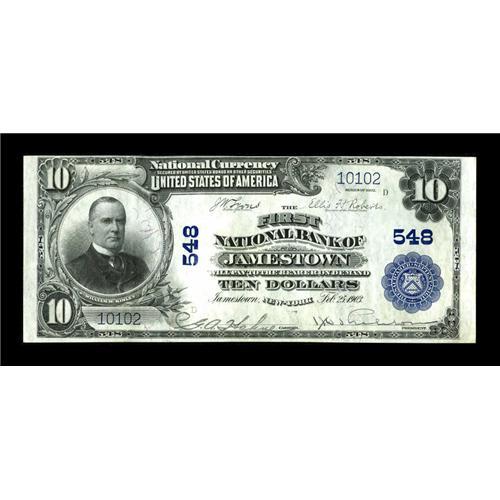<B>Jamestown, NY</B></I> - $10 1902 Plain Back Fr. 624 <B>The First NB</B></I> Ch. # 548<BR>A bright and attractive specimen which appears New until closely examined. <B>Extremely Fine.</B></I><BR><BR><b>Shipping:</b> Coin/Currency (<a target="_blank" href="http://www.heritageauctions.com/common/shipping.php">view shipping information</a>)