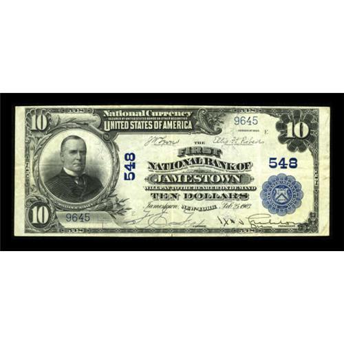 <B>Jamestown, NY</B></I> - $10 1902 Plain Back Fr. 624 <B>The First NB</B></I> Ch. # 548<BR> A nice evenly circulated example from this tougher Jamestown bank. Bright <B>Fine-Very Fine.</B></I><BR><I>From The Thomas A. Bergin Collection</B></I><BR><BR><b>Shipping:</b> Coins & Currency (<a target="_blank" href="http://www.heritageauctions.com/common/shipping.php">view shipping information</a>)