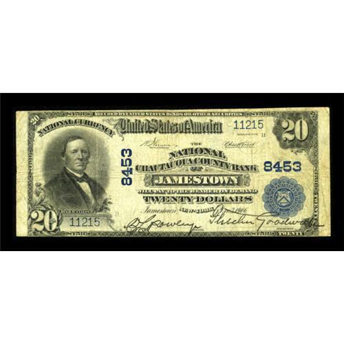 <B>Jamestown, NY</B></I> - $20 1902 Plain Back Fr. 652 <B>The National Chautauqua County Bank</B></I> Ch. # 8453<BR> An evenly circulated piece displaying strong signatures. <B>Very Good-Fine.</B></I><BR><I>From The Thomas A. Bergin Collection</B></I><BR><BR><b>Shipping:</b> Coins & Currency (<a target="_blank" href="http://www.heritageauctions.com/common/shipping.php">view shipping information</a>)
