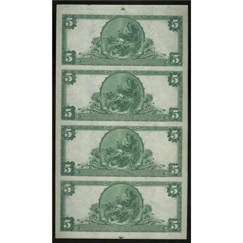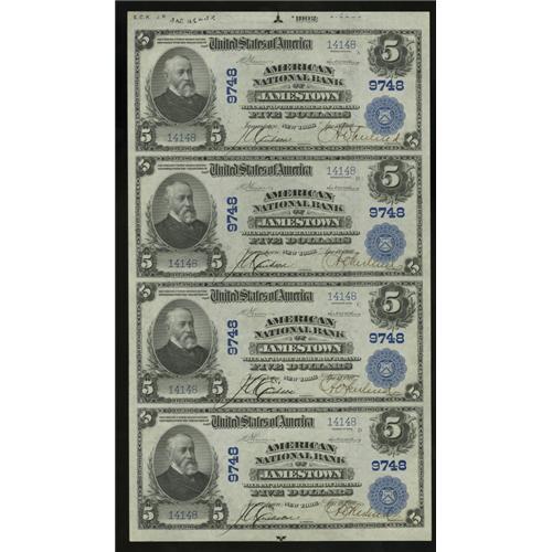 <B>Jamestown, NY</B></I> - $5-$5-$5-$5 1902 Plain Back Fr. 601 <B>American NB</B></I> Ch. # 9748 Uncut Sheet<BR>This is the only large size uncut sheet known on this bank and it is a pure delight with its flamboyant pen signatures, white paper, and dark inks. Intense scrutiny could not come up with any faults. We'Il keep the grade level at <B>Gem Crisp Uncirculated</B></I> only because we seldom, if ever grade Nationals higher.<BR><BR><b>Shipping:</b> Coin/Currency (<a target="_blank" href="http://www.heritageauctions.com/common/shipping.php">view shipping information</a>)