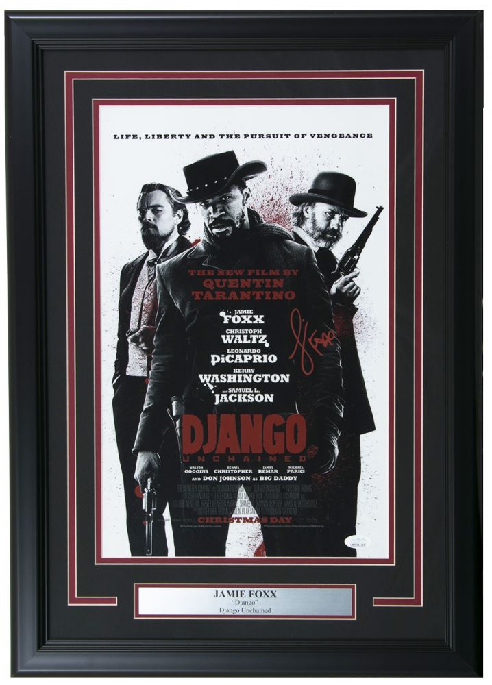 The custom frame measures 17" x 25" in size size and features a photo that has been hand-signed in red paint pen by Jamie Foxx.