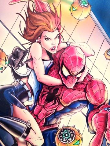 D.C. Comic artist "Jamie Tyndall" printed drawing of Spiderman in flight, spinning a web and deflecting pumpkins from the Green Goblin pumpkin bombs. Dated 2008 Marvel Comics. Glass frame. (17x21)