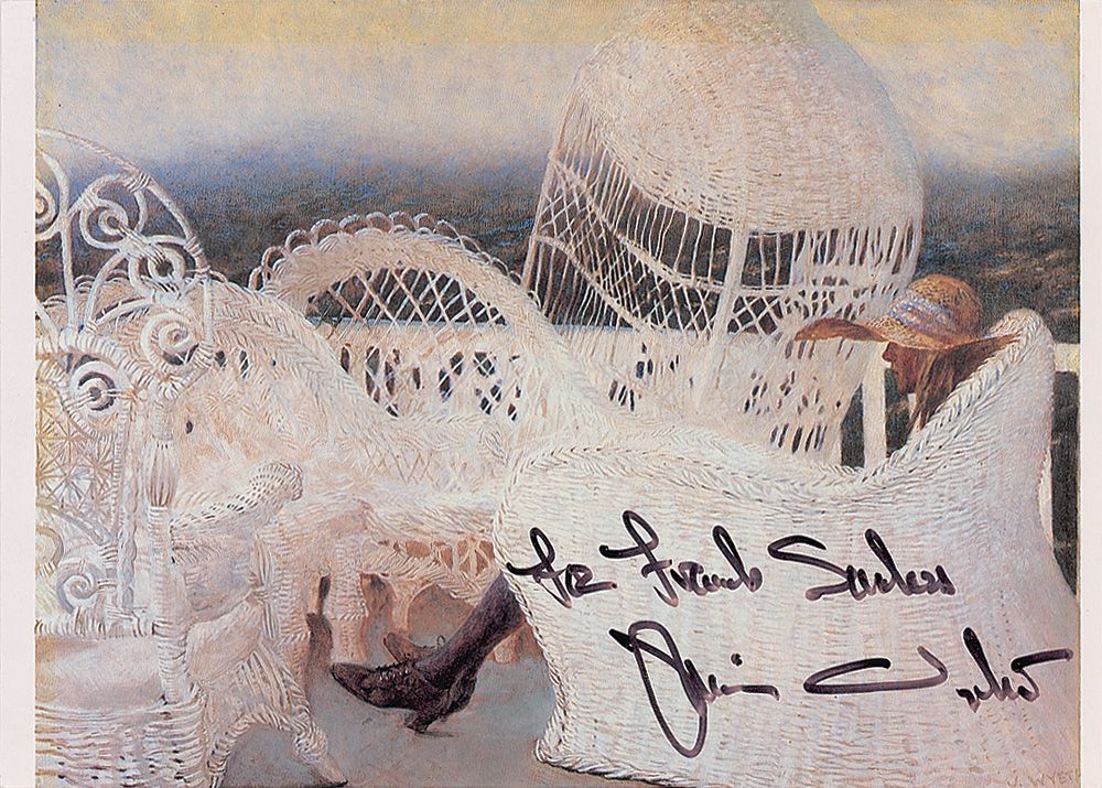 Color 7 x 5 postcard photo of Wyeth’s painting entitled ‘Wicker,’ signed and inscribed in black felt tip “For Frank Sanders, Jamie Wyeth.” In fine condition, with a band of toning to the upper border.