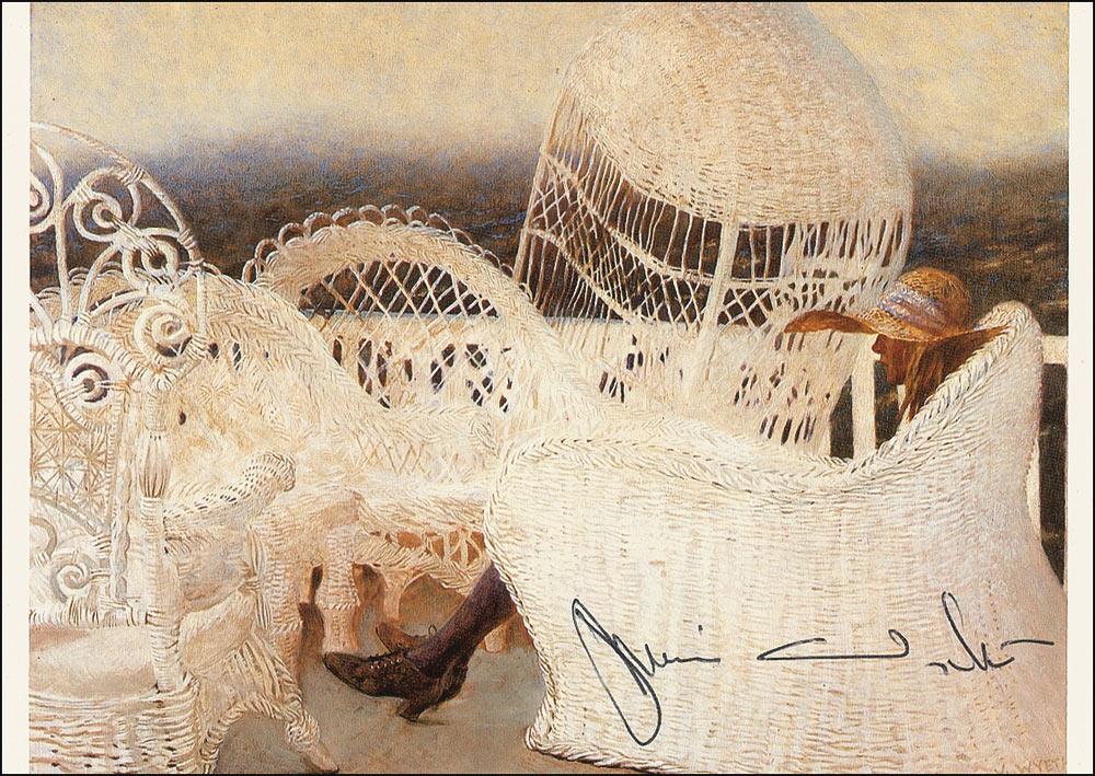 Highly regarded American artist (born 1946). A member of the distinguished Wyeth dynasty of painters (which includes grandfather N. C. Wyeth and father Andrew Wyeth), he had his first one-man show in New York City at the age of 20. Color 7 x 5 cardstock photo of Wyeth’s work entitled Wicker, signed in black ink. In fine condition. RRAuction COA.