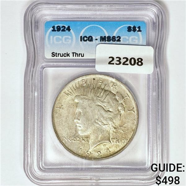 1924 Silver Peace Dollar ICG MS62 Struck Thru38125a - 1924 Silver Peace Dollar ICG MS62 Struck Thru
