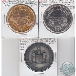 3x Canada Vancouver, B.C Numismatic Coin Club Medallions. This lot includes: 1858-1958 Centennial Go