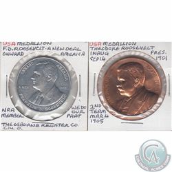 Pair of United States Franklin D. Roosevelt and Theodore Roosevelt Medallions. You will receive the NRA Franklin Roosevelt and the Inauguration Theodo