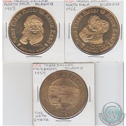 3x United States Alaska Trade Dollars. You will receive 1963 and 1966 Santa Land North Pole, Alaska