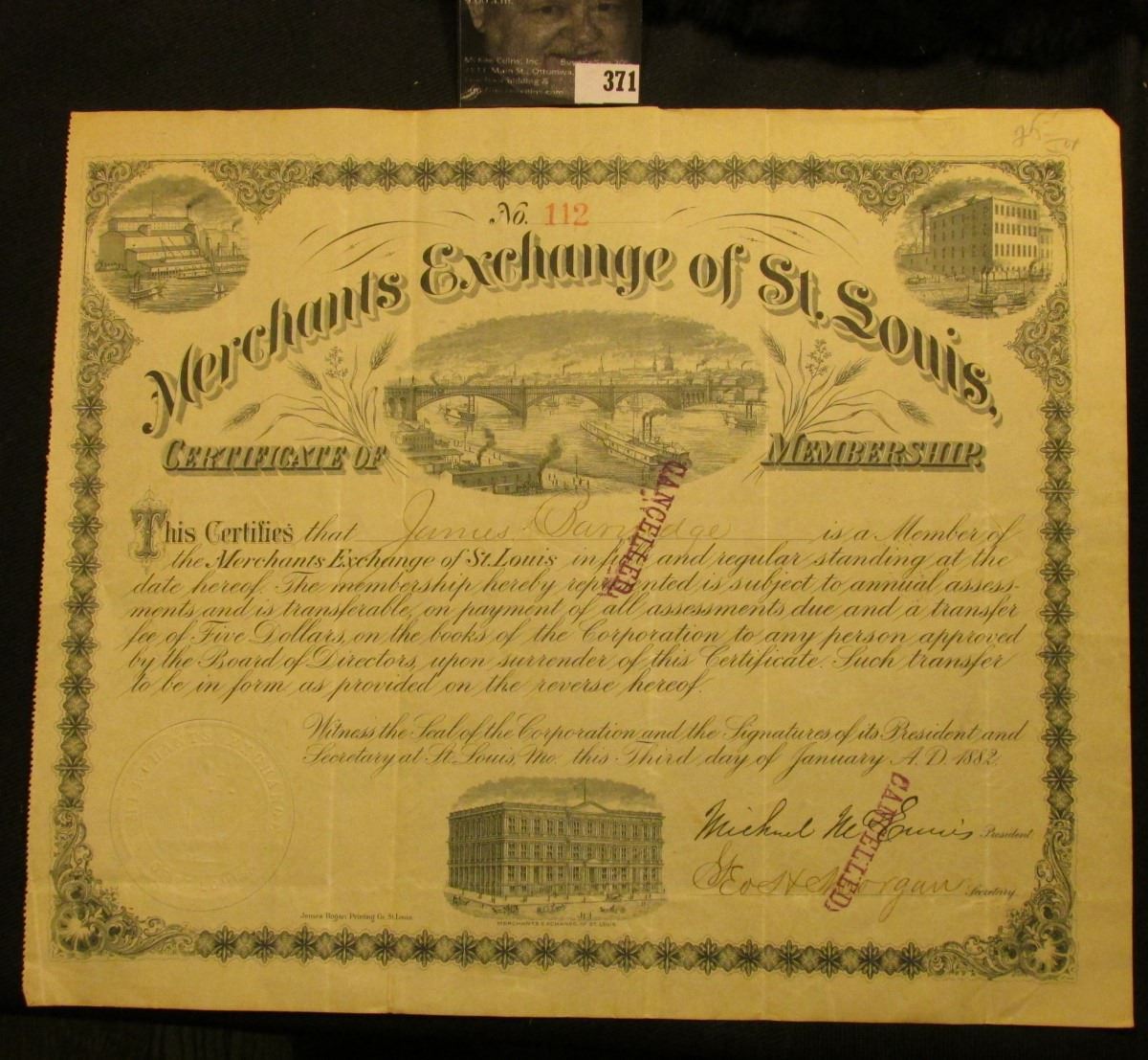 Jan. 3rd, 1882 9 3/4" x 11 1/2" "Merchants Exchange of St. Louis Certificate of Membership", with vignettes of bridge over Mississippi, barges, factories, etc. Embossed with seal. Signed and transferred in 1884 on reverse.