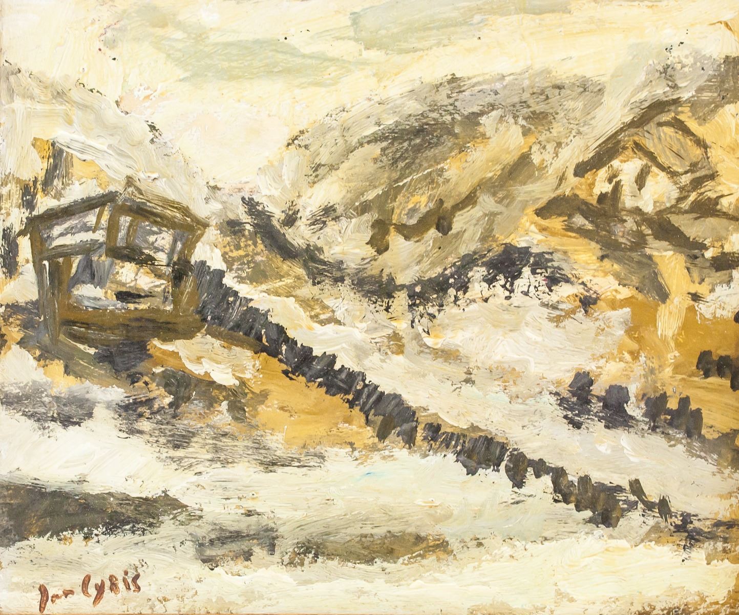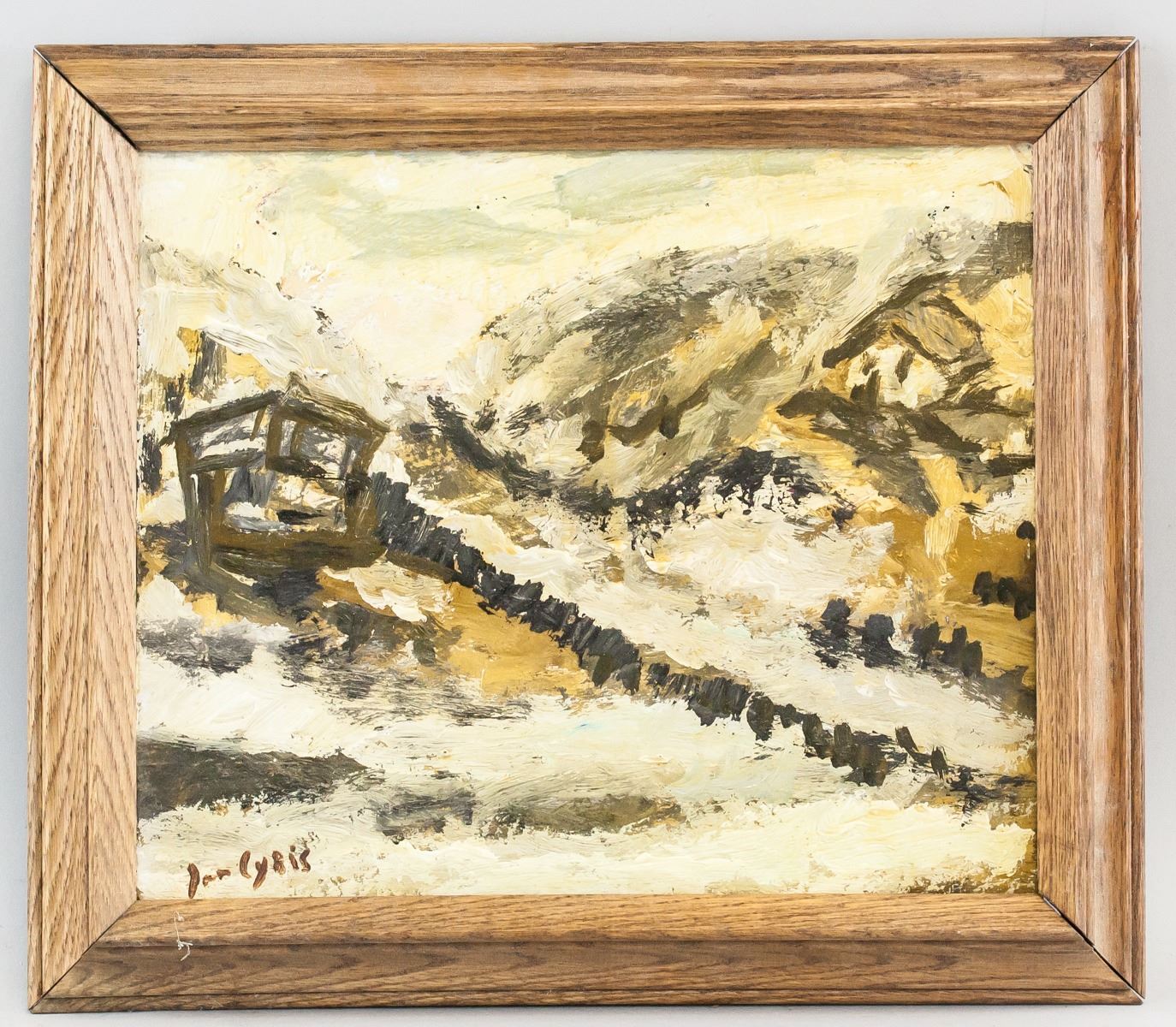 Gouache on board, framed. Featuring an abstract landscape scene. Signed Jan Cybis on the lower left corner. Attributed Jan Cybis (1897-1972, Polish). 28 x 31 cm (11 x 12 inches) Frame: 34 x 39 cm (13 x 15 inches). Provenance: This lot carries limited provenance from a Southern Ontario estate